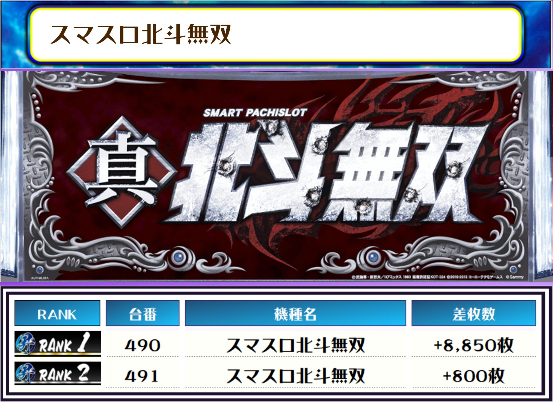 この日の全体差枚トップは【スマスロ北斗無双・490番台】の+8,850枚っ🎉