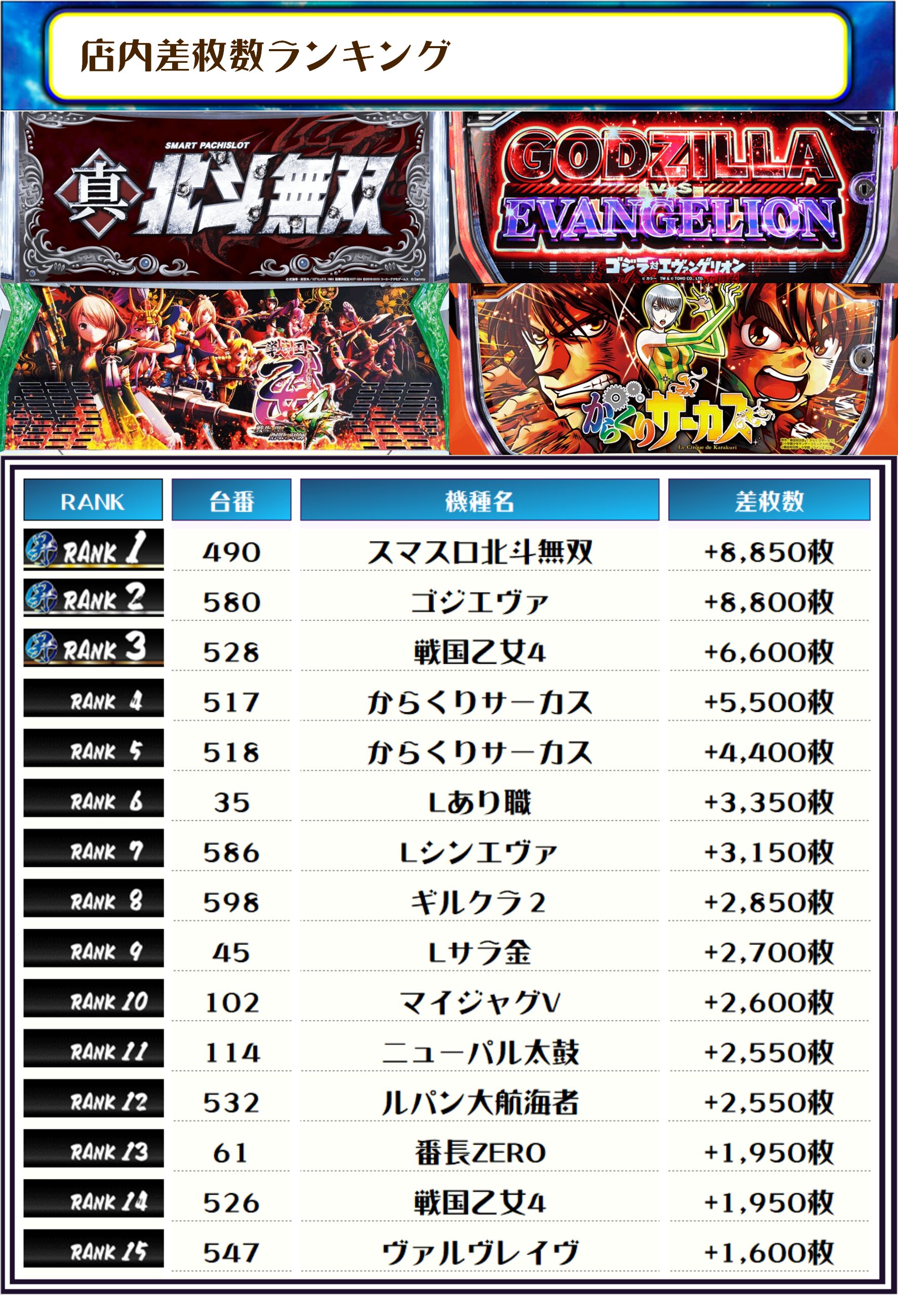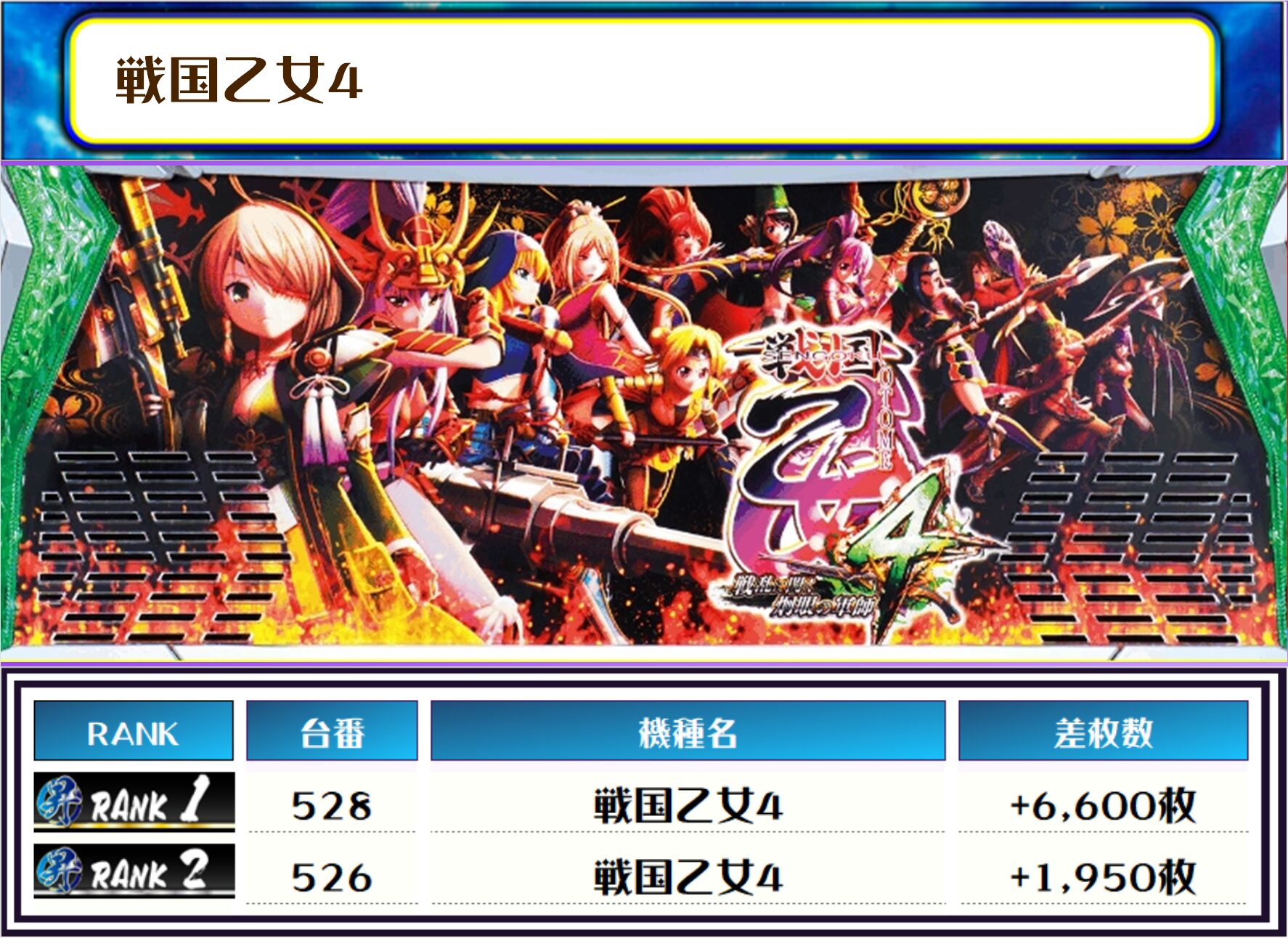 続く2位には【ゴジエヴァ・580番台】の+8,800枚、3位には【戦国乙女4・528番台】の+6,600枚がランクインしました🎉🎉🎉🎉🎉