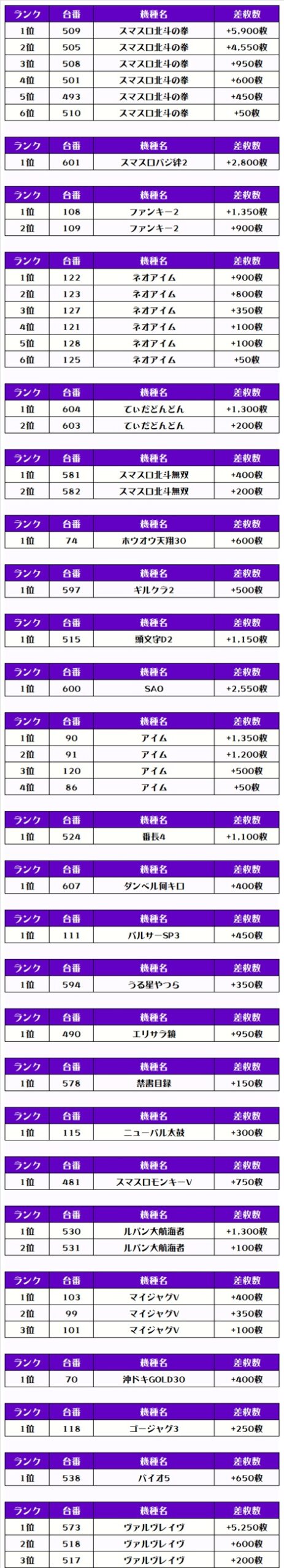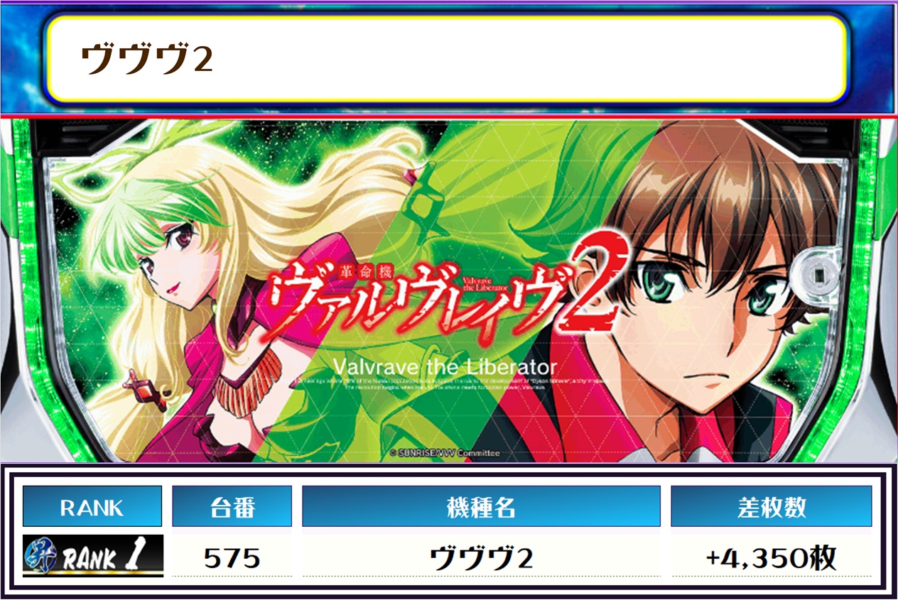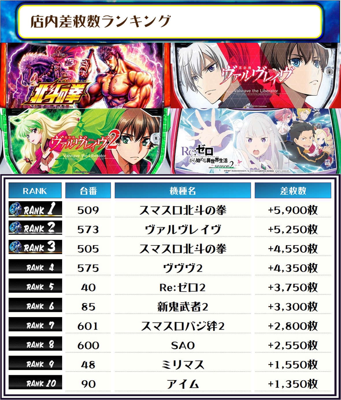 続く2位には【ヴァルヴレイヴ・573番台の+5,250枚、3位にはスマスロ北斗の拳・539番台の+4,550枚がランクインしました🎉🎉🎉🎉🎉