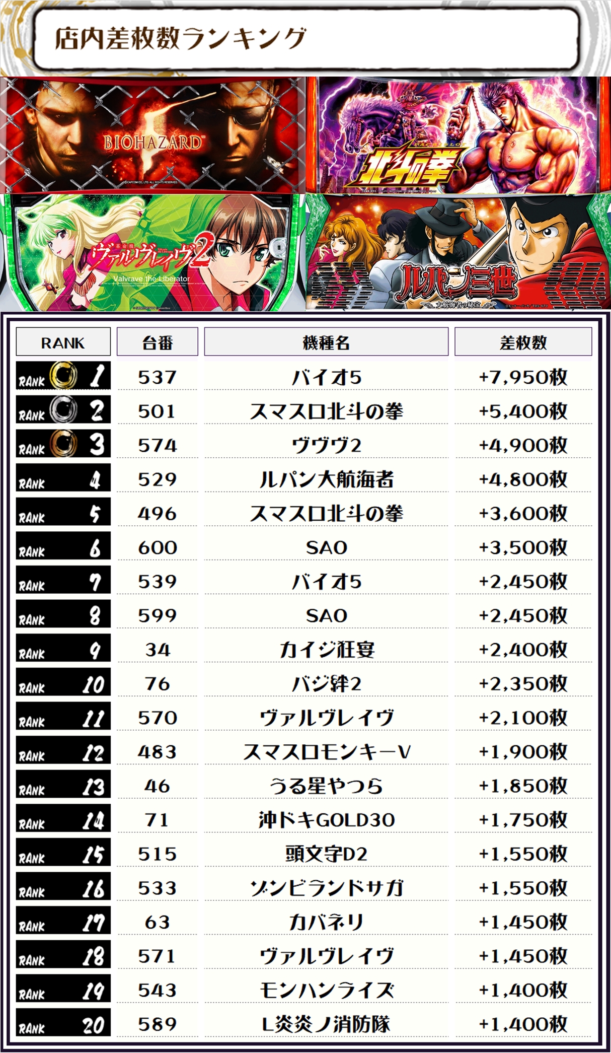 続く2位には【スマスロ北斗の拳・501番台】の+5,400枚、そして3位には【ヴヴヴ2・574番台】の+4,900枚がランクインしましたっ🏆🏆🏆