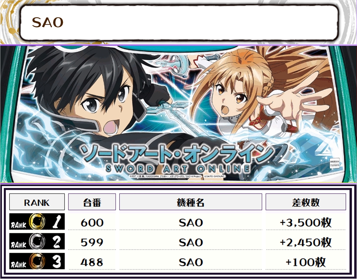 ピックアップしたSAOは惜しくも全台プラスにはならなかったものの、もう1台も差枚がプラマイゼロだったので、まずまずの結果となりました🔥