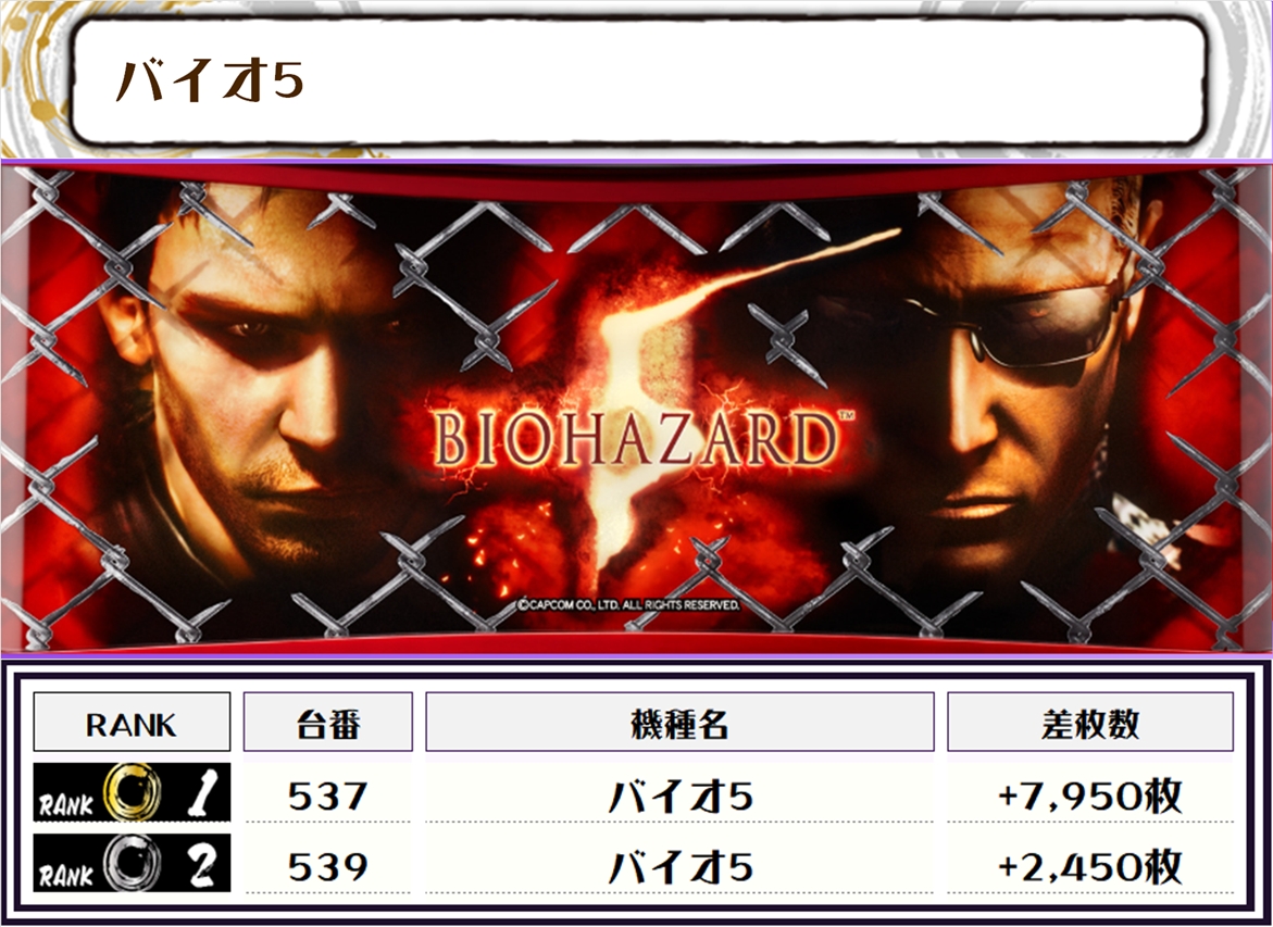 この日、全体の差枚トップに輝いたのは【バイオ5・537番台】で+7,950枚‼️