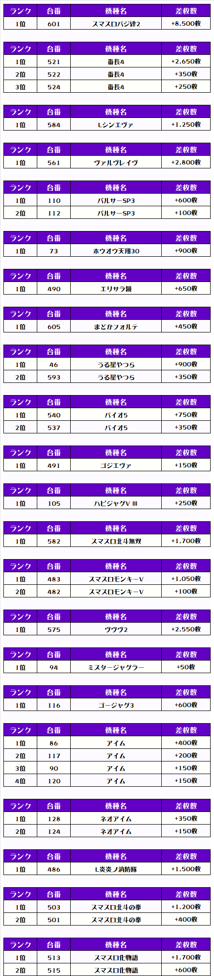 この日、全体の差枚トップに輝いたのは【スマスロバジ絆2・601番台】で+8,500枚‼️