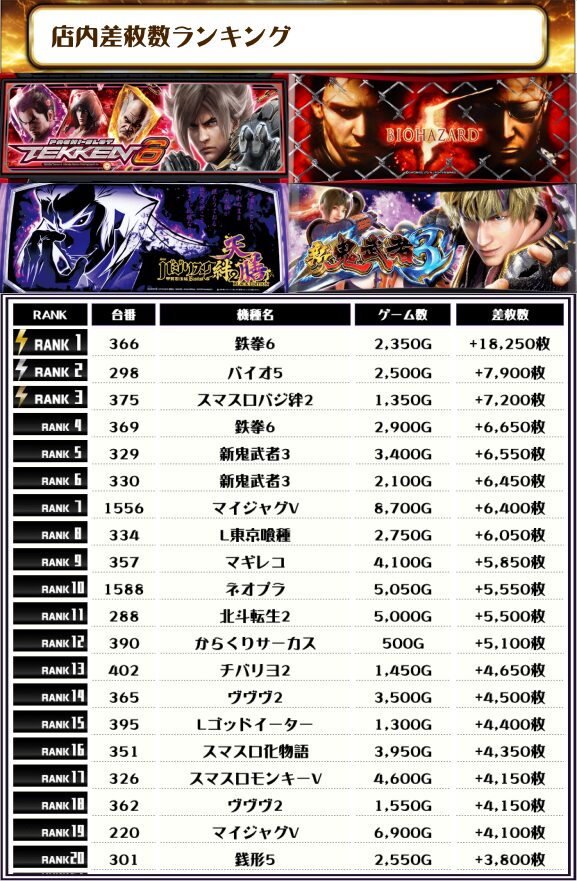 続いては【店内全台の差枚ランキング】をご覧ください!