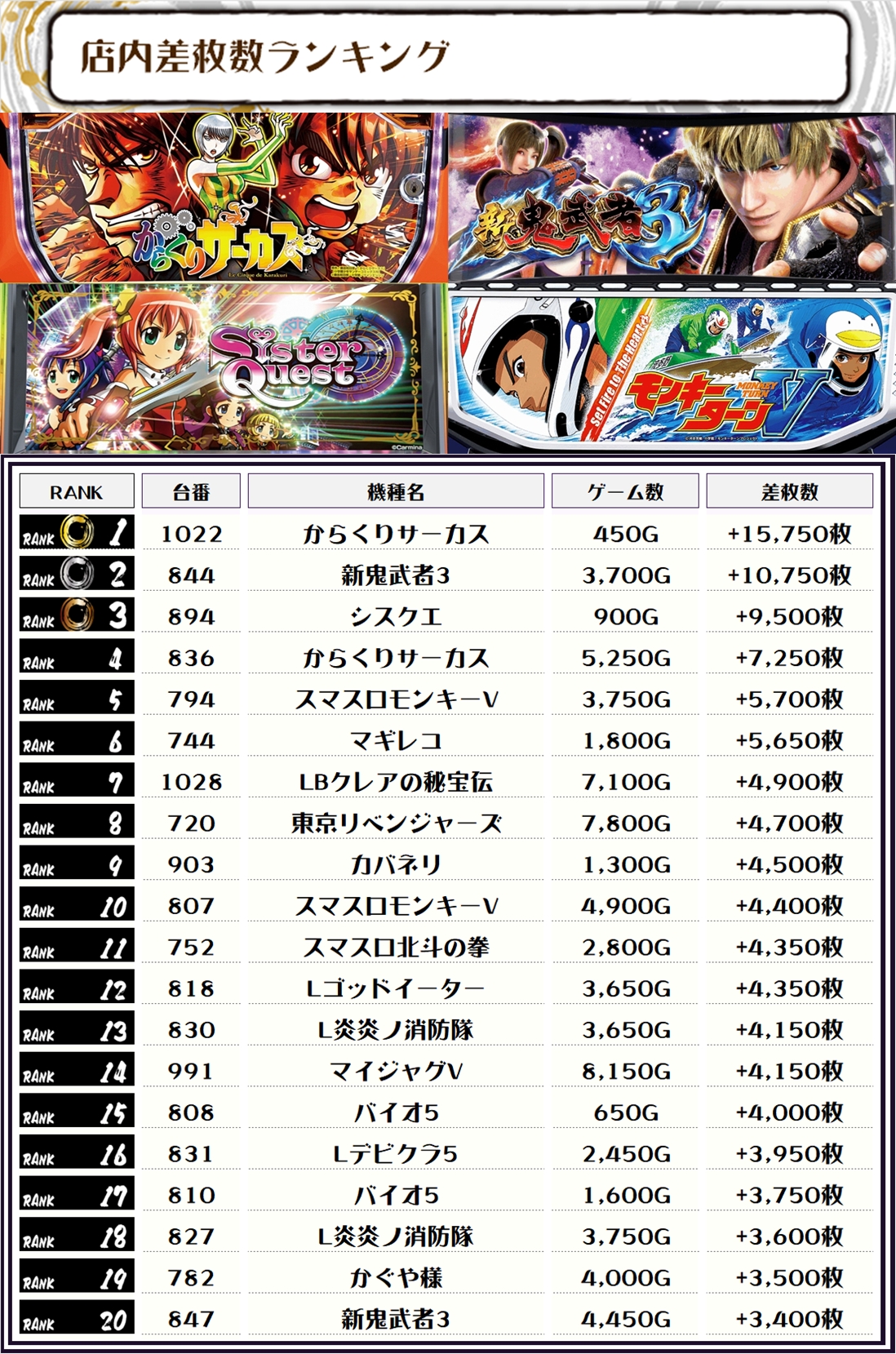 2位には新台の【新鬼武者3・844番台】の+10,750枚、そして3位には【シスクエ・894番台】の+9,500枚がランクインっ🏆🏆🏆