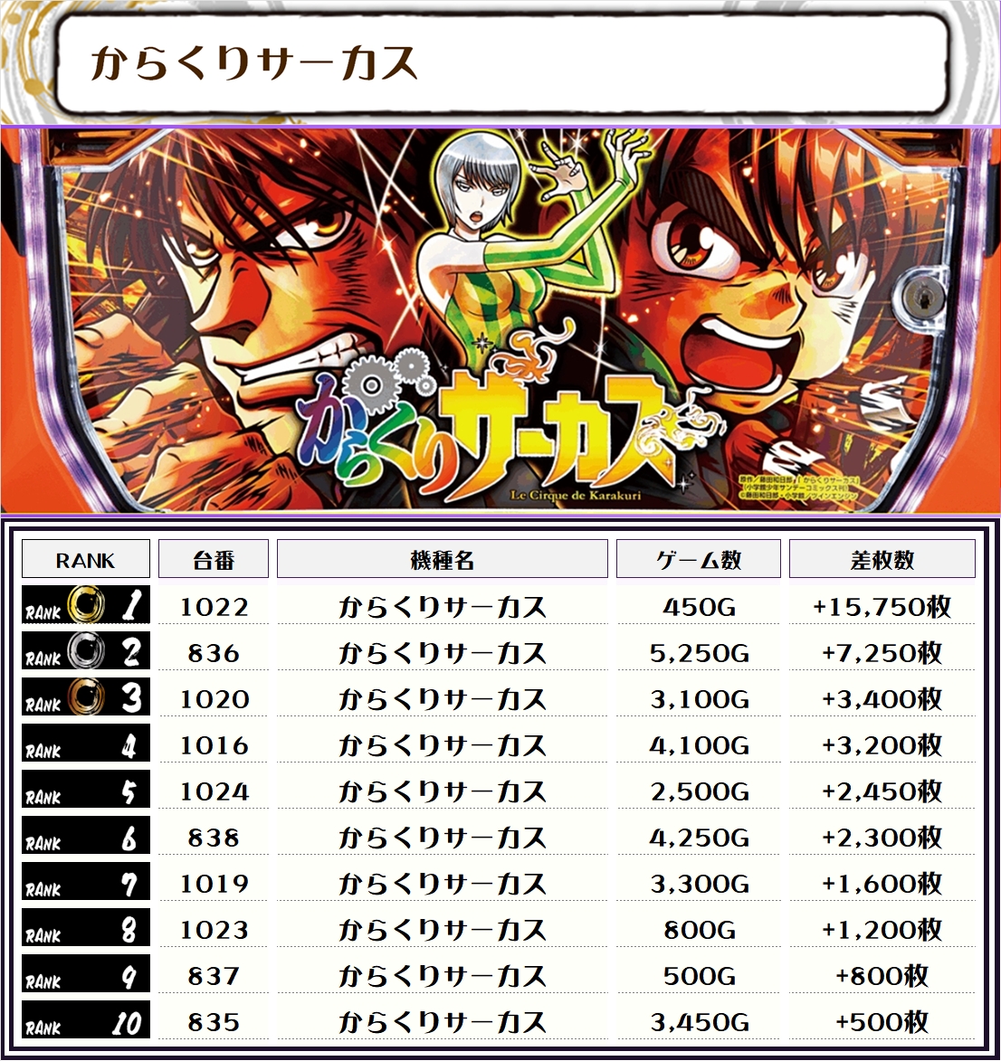 この日、全体のトップに輝いたのは【からくりサーカス・1022番台】で+15,750枚‼️