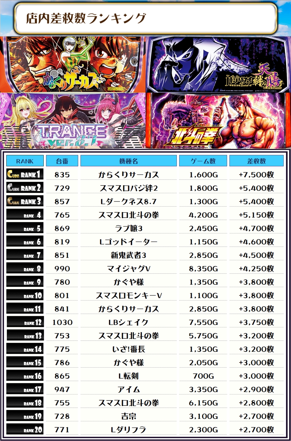 それでは、早速この日の【機種別差枚ランキング】を見ていきやしょう❗️