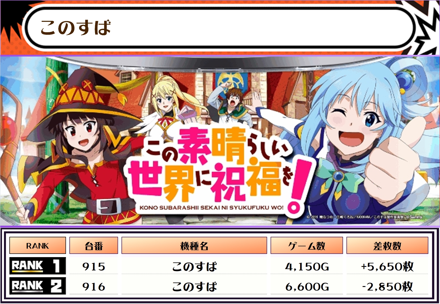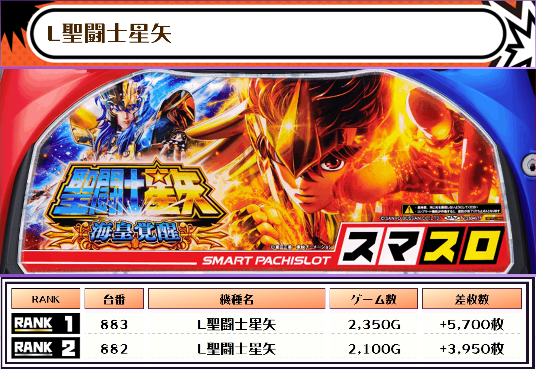 2位には【L星闘士星矢・883番台】の+5,700枚、そして3位には【このすば・915番台】の+5,650枚がランクインっ🏆🏆🏆🏆
