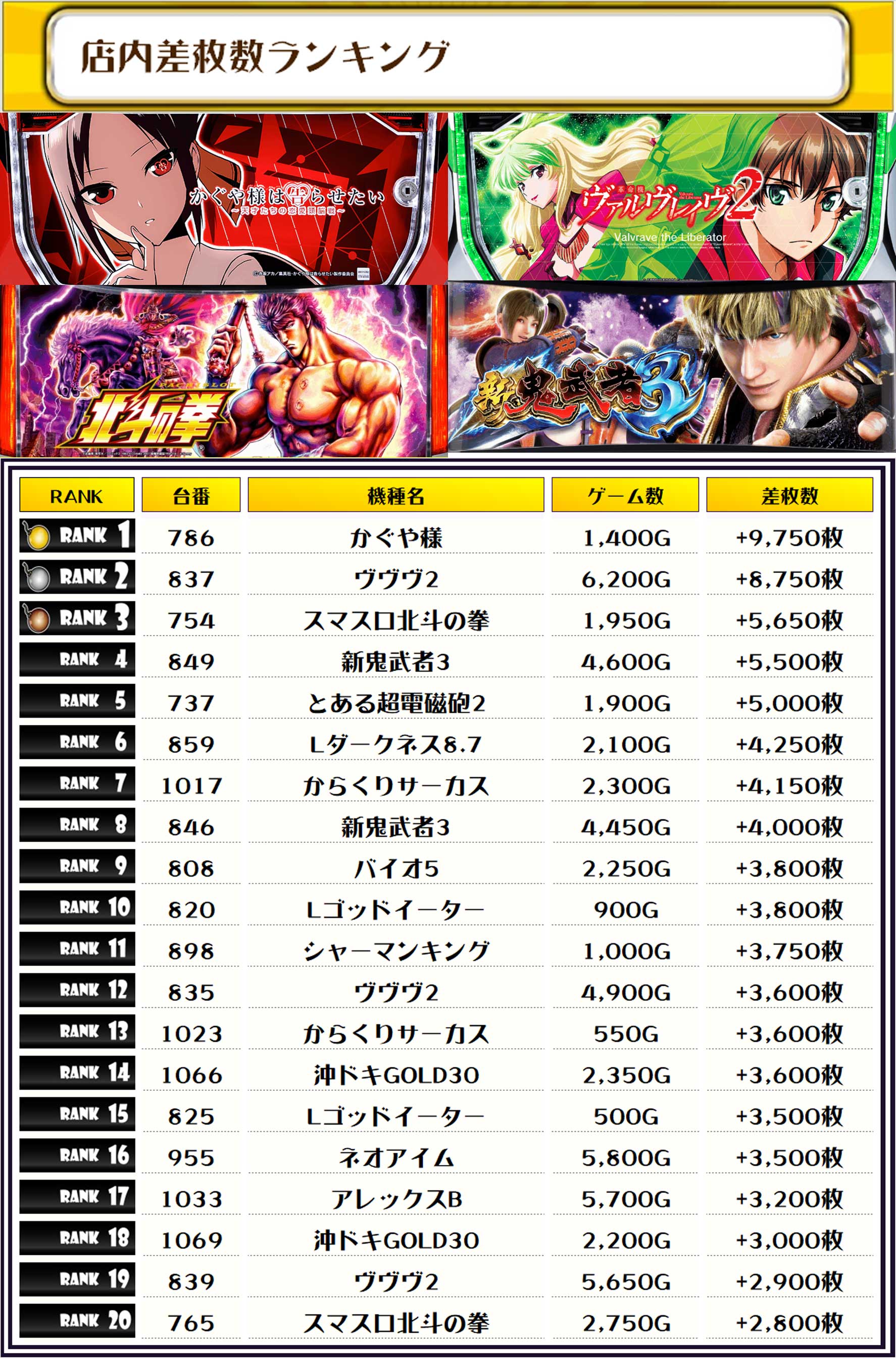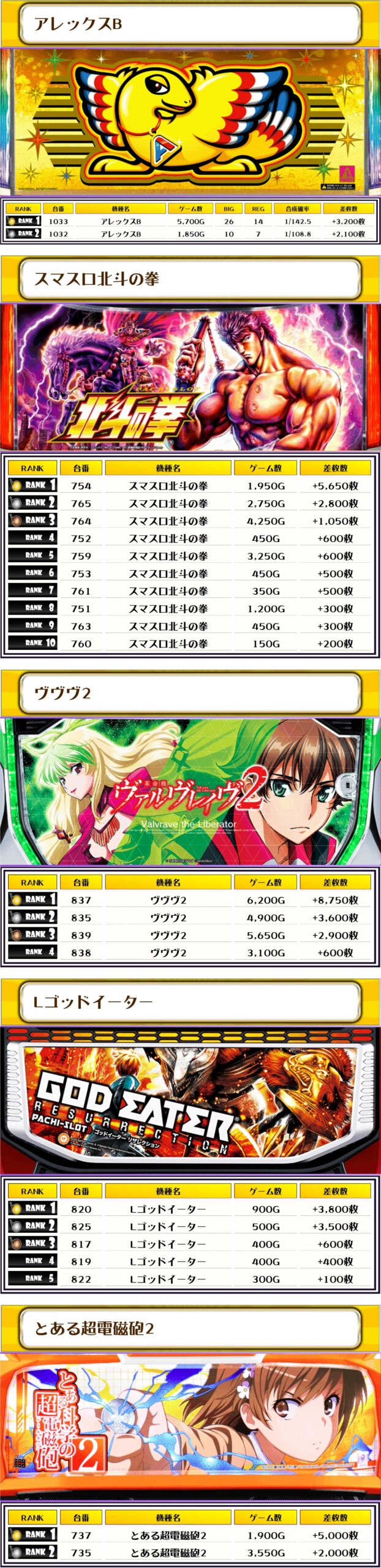続く2位には【ヴヴヴ2・837番台】の+8,750枚、そして3位には【スマスロ北斗の拳・754番台】の+5,650枚がランクインしましたっ❗️