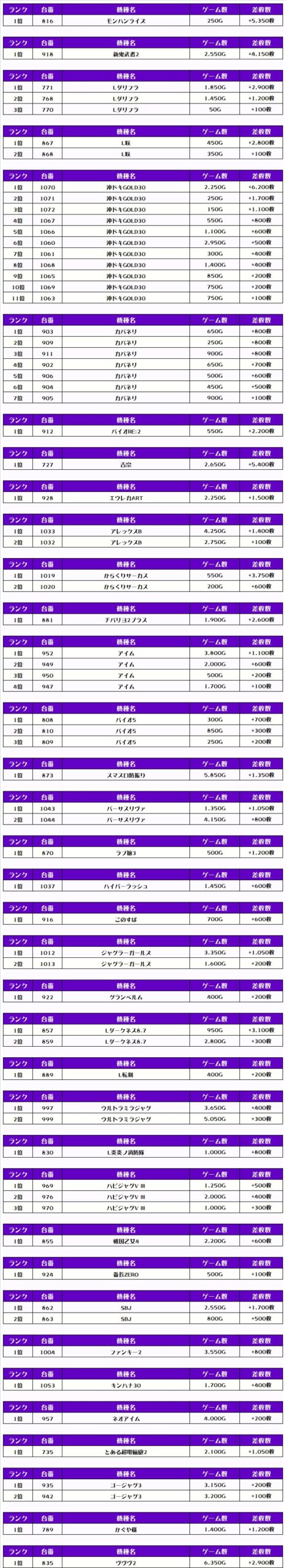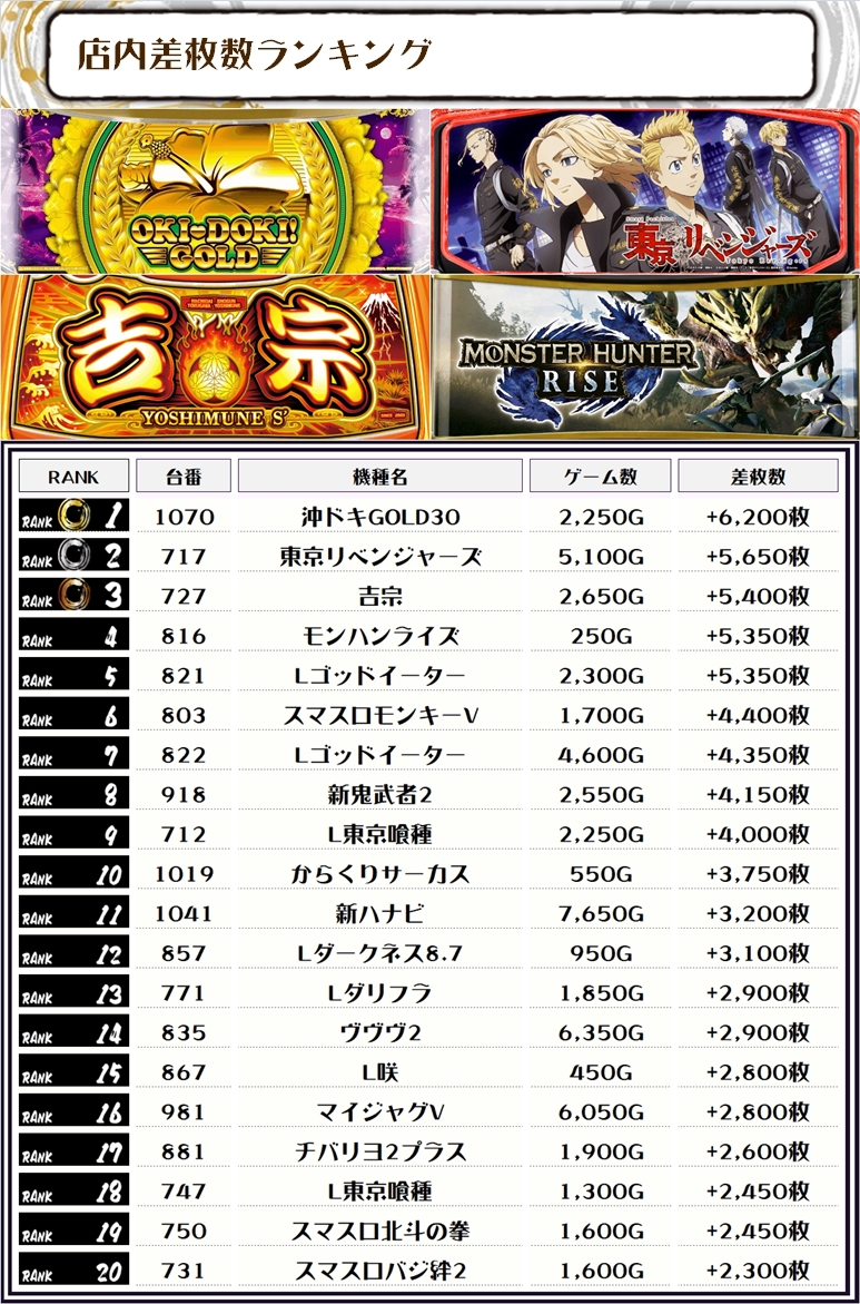 2位には【東京リベンジャーズ・717番台】の+5,650枚、そして3位には【吉宗・727番台】の+5,400枚がランクインっ🏆