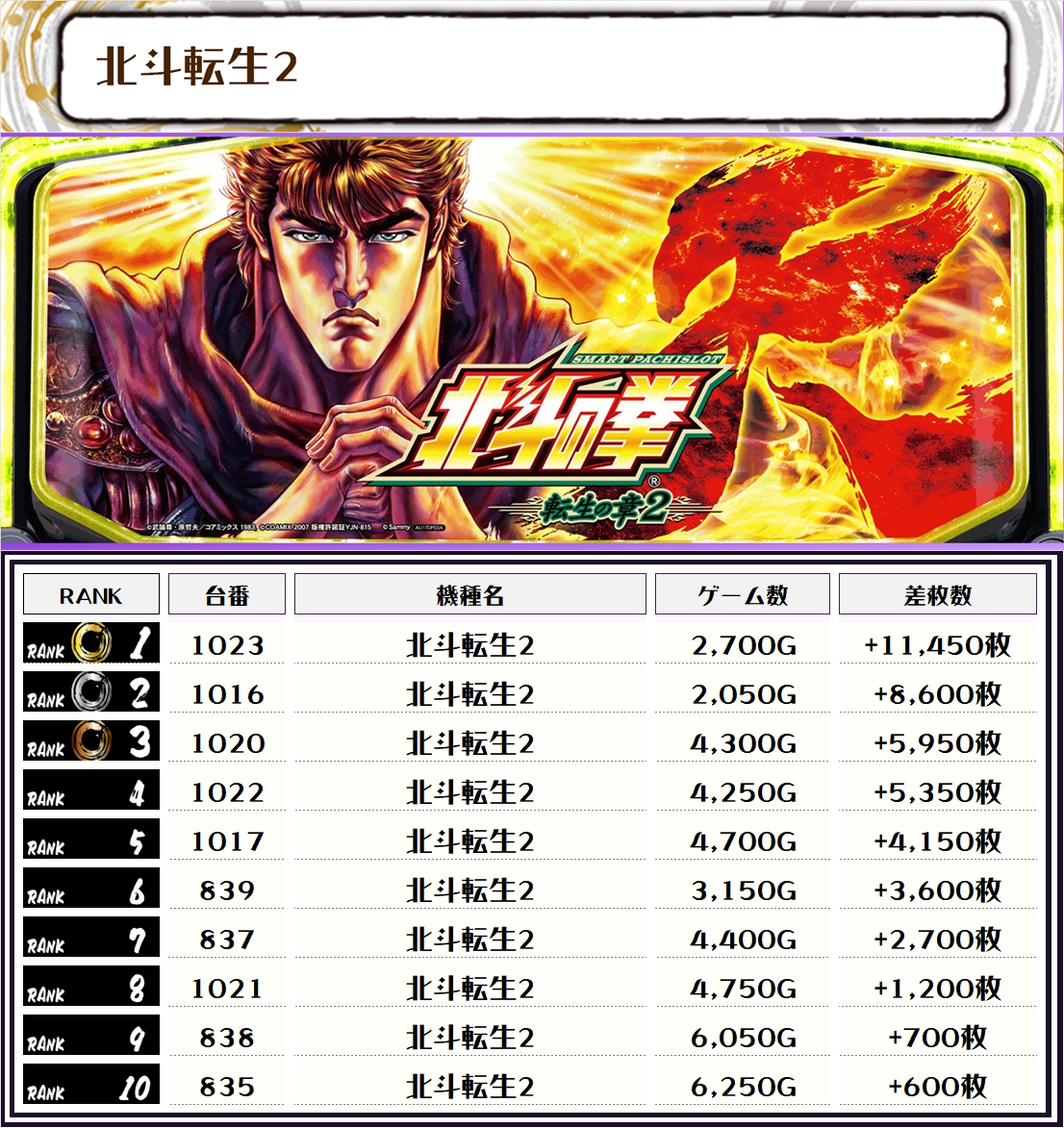 2位には【L攻殻機動隊・721番台】の+13,150枚、そして3位には【北斗転生2・1023番台】の+11,450枚がランクインっ🏆