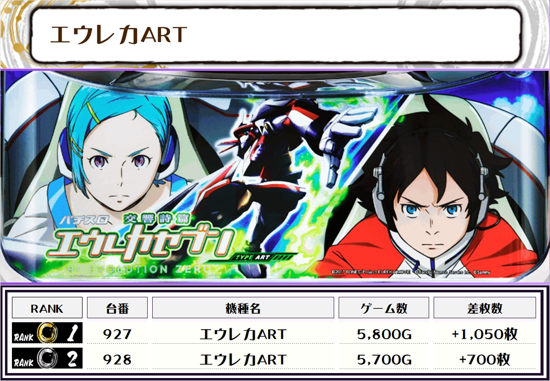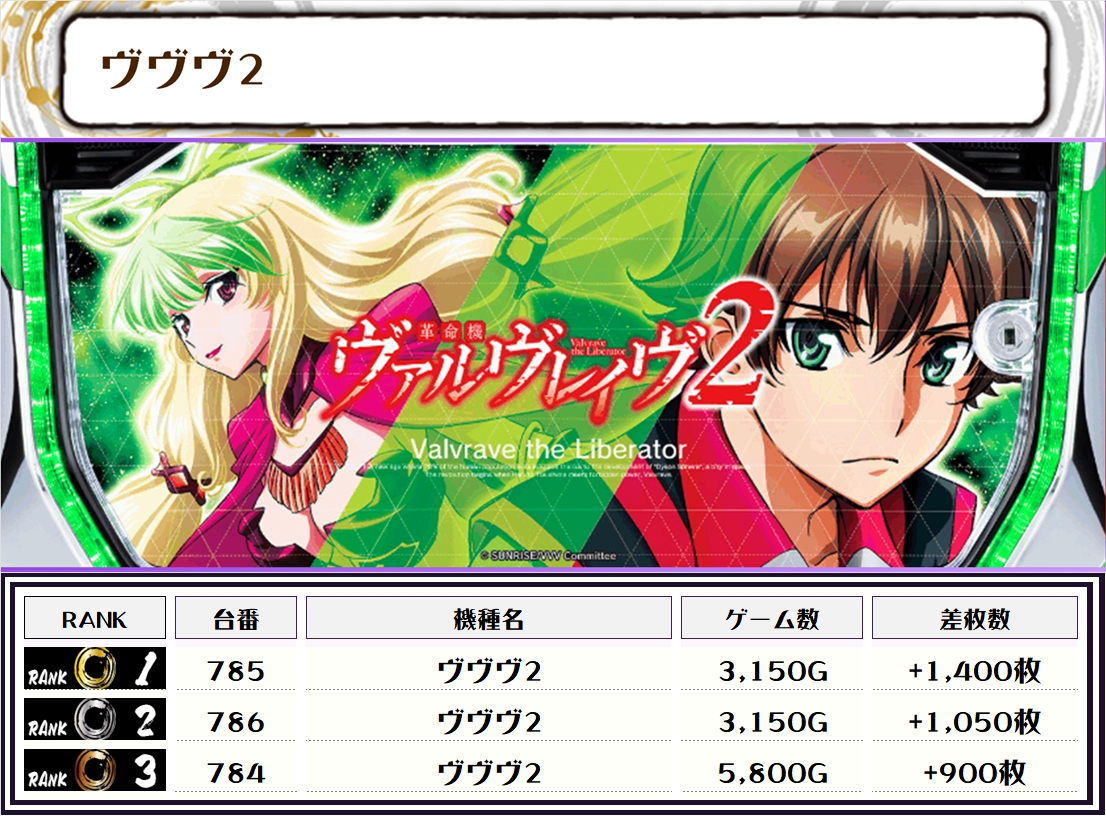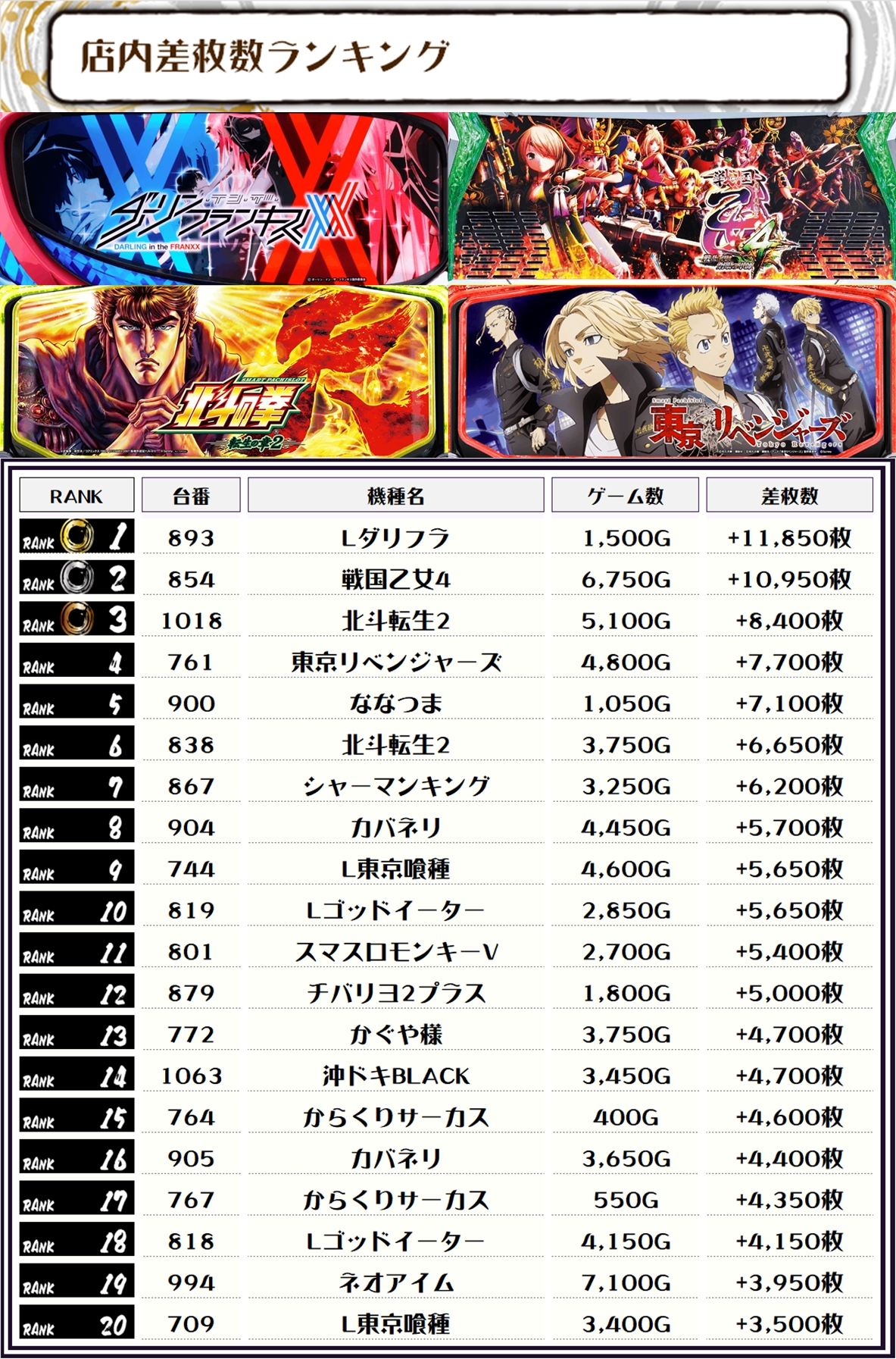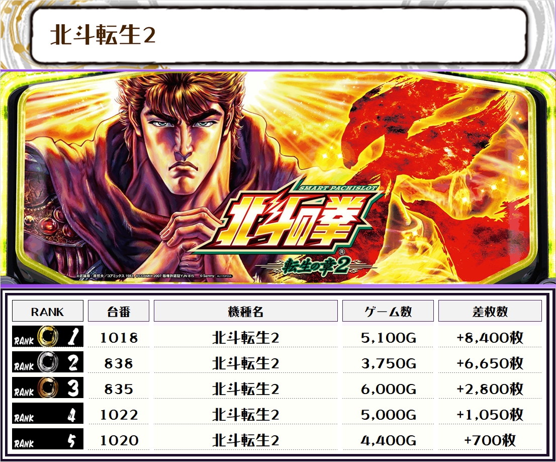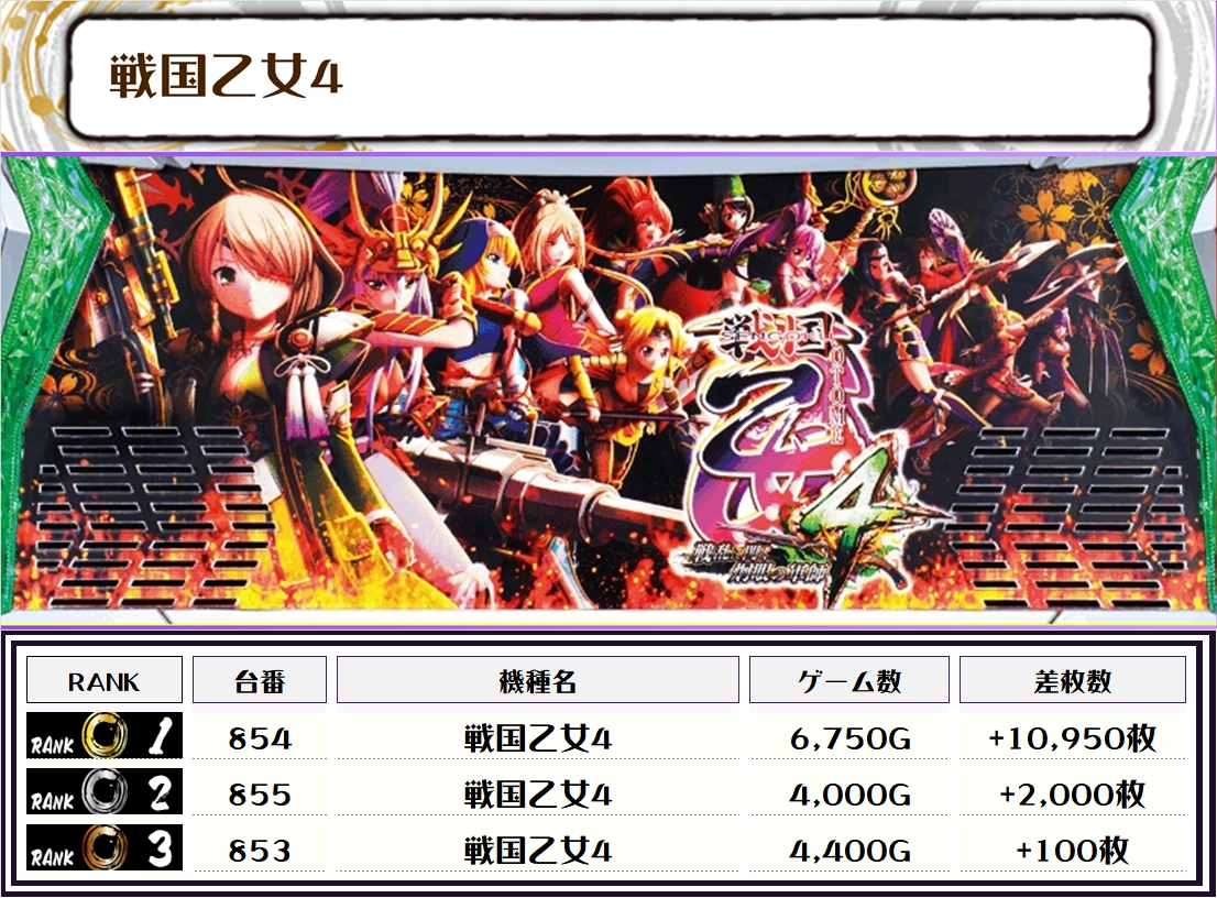 2位には【戦国乙女4・854番台】の+10,950枚、そして3位には【北斗転生2・1018番台】の+8,400枚がランクインっ🏆
