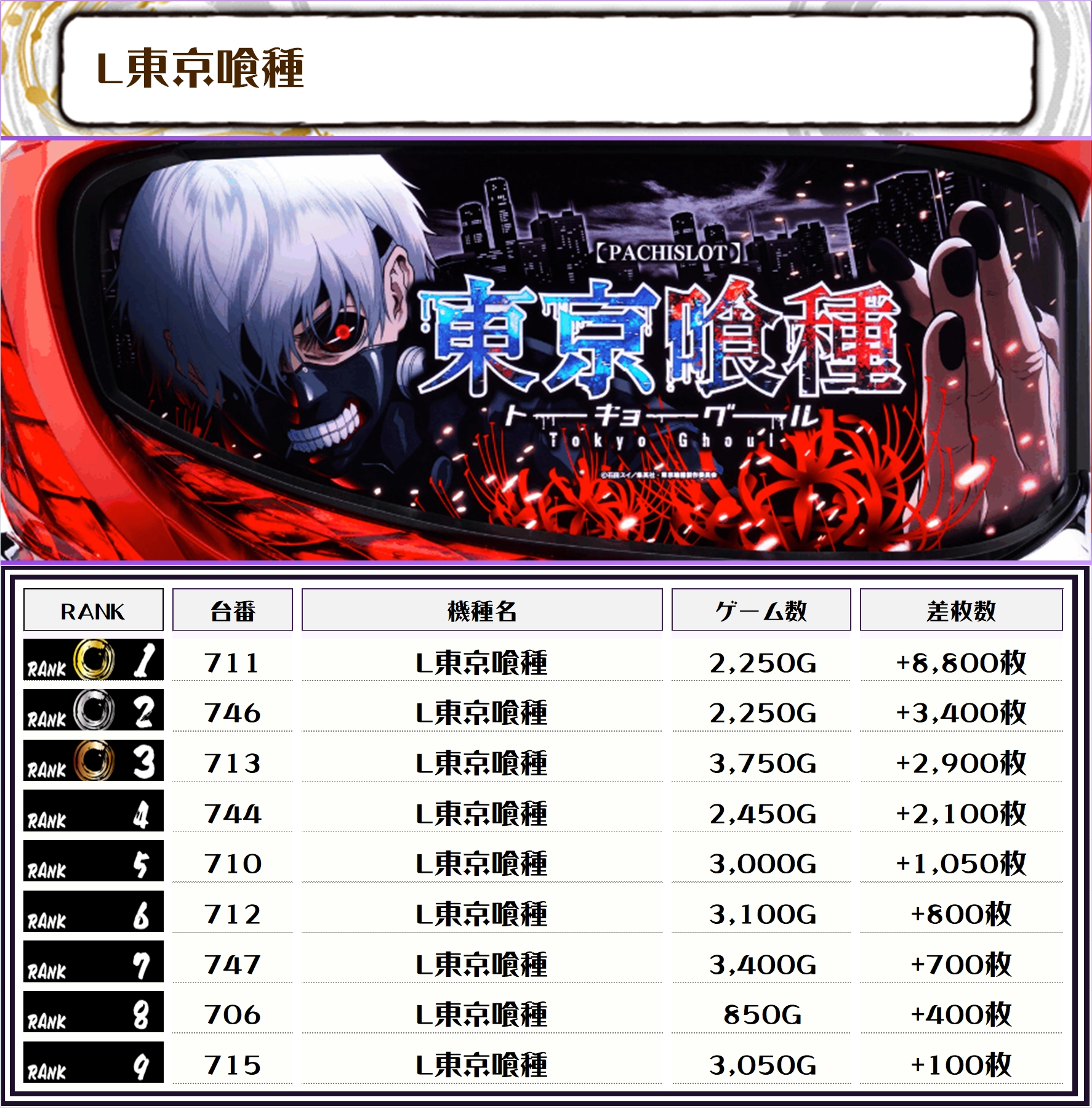 この日、全体の差枚トップに輝いたのは【L東京喰種・711番台】で+8,800枚‼️
