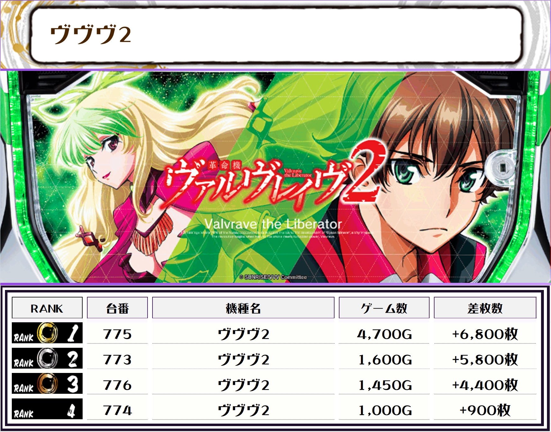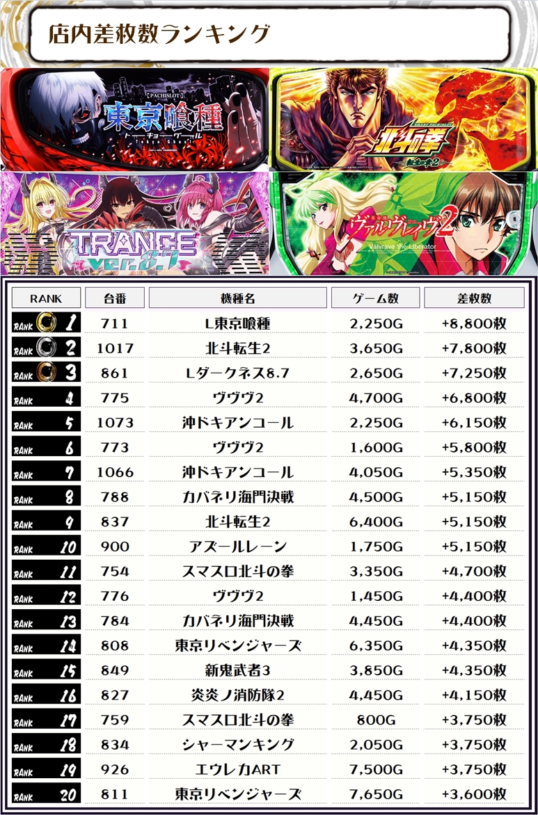 2位には【北斗転生2・1017番台】の+7,800枚、そして3位には【Lダークネス8.7・861番台】の+7,250枚がランクインっ🏆