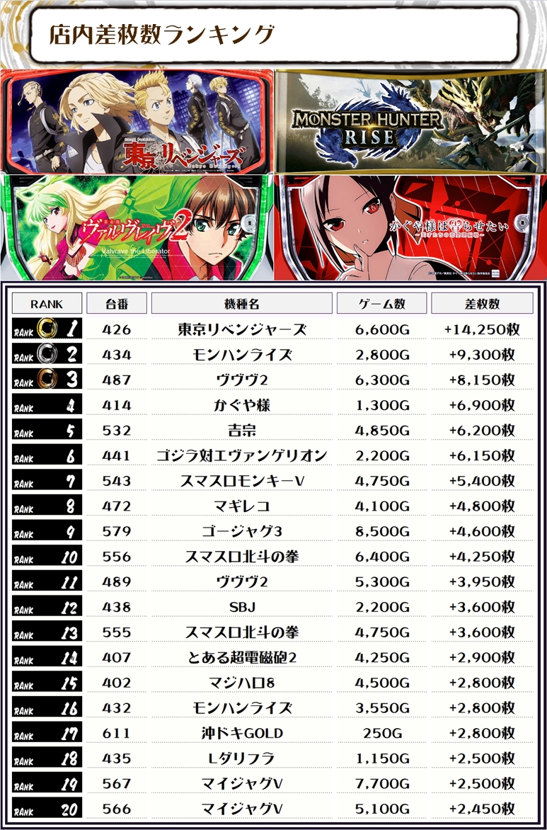 2位には【モンハンライズ・434番台】の+9,300枚、3位には【ヴヴヴ2・487番台】の+8,150枚がランクインっ🏆🏆🏆🏆