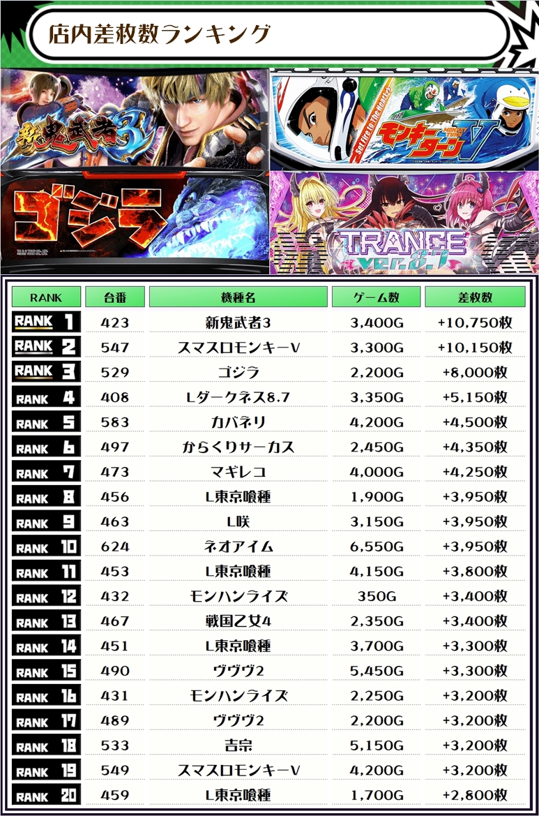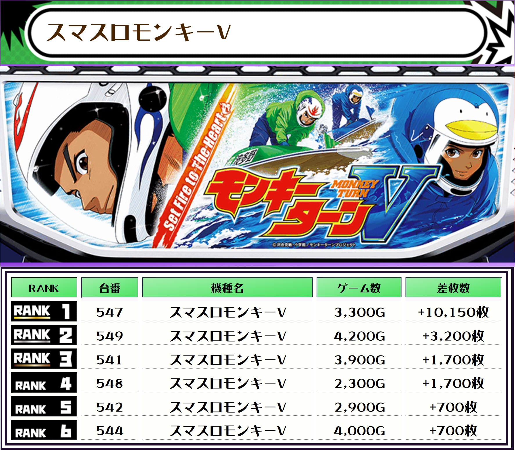 2位には【スマスロモンキーV・547番台】の+10,150枚、そして3位には【ゴジラ・529番台】の+8,000枚がランクインしているな✨