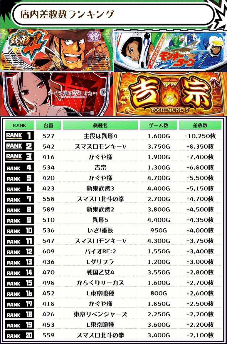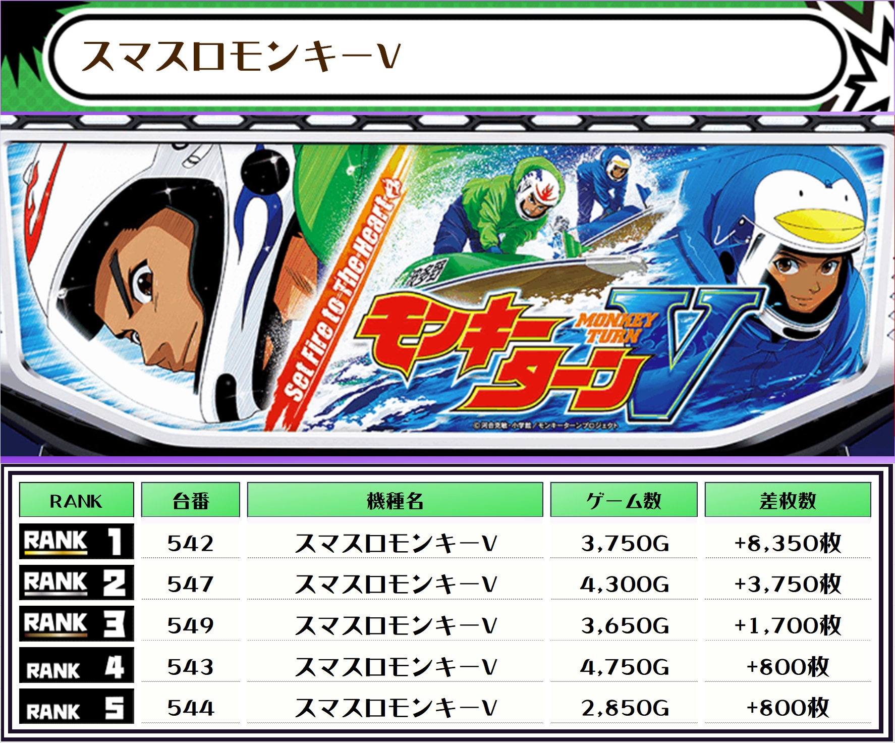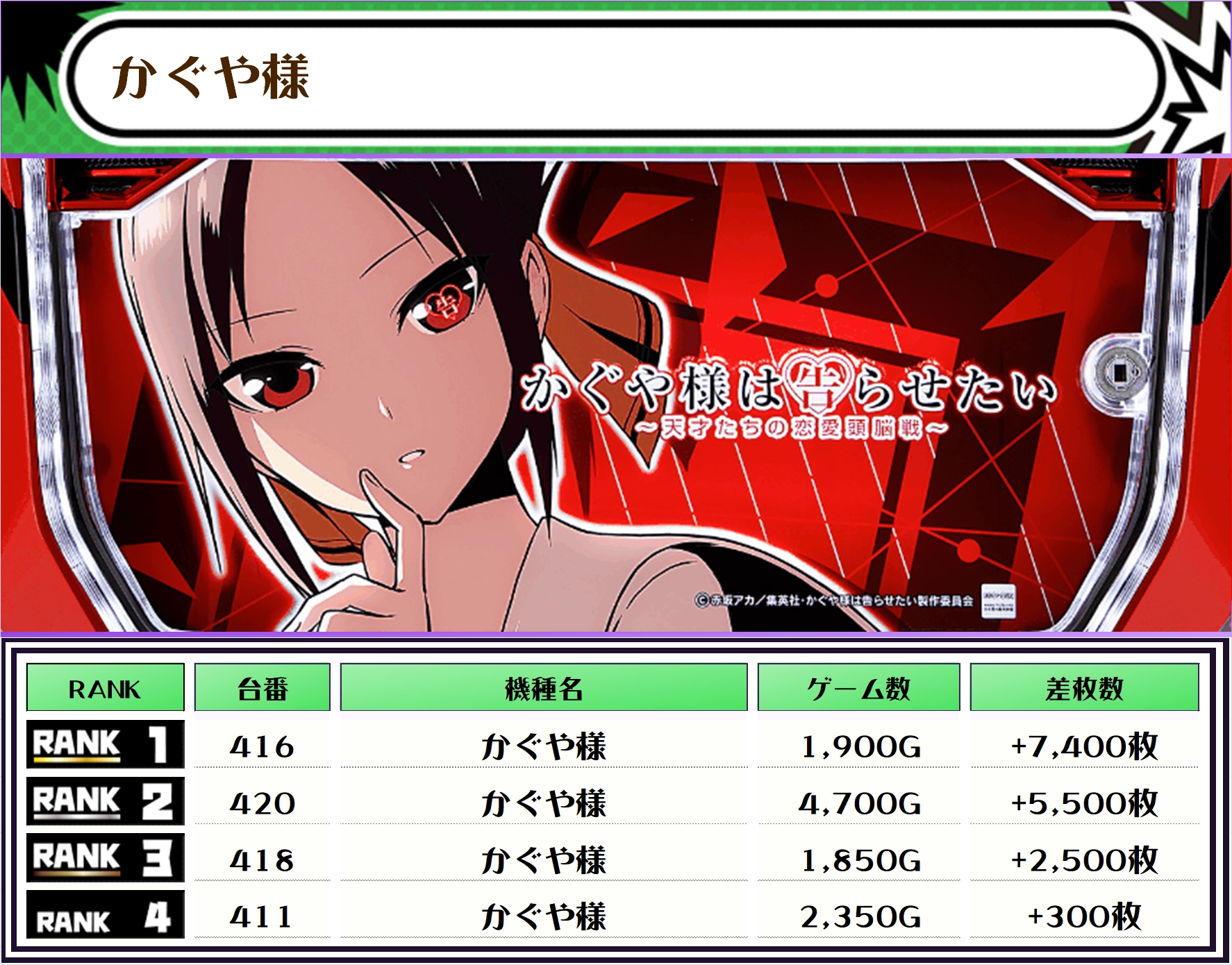 2位には【スマスロモンキーV・542番台】の+8,350枚、そして3位には【かぐや様・416番台】の+7,400枚がランクインしていますね✨