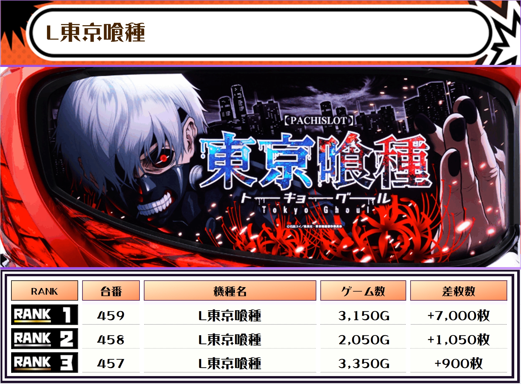 この日、全体の差枚トップに輝いたのは【L東京喰種・459番台】の+7,000枚‼️