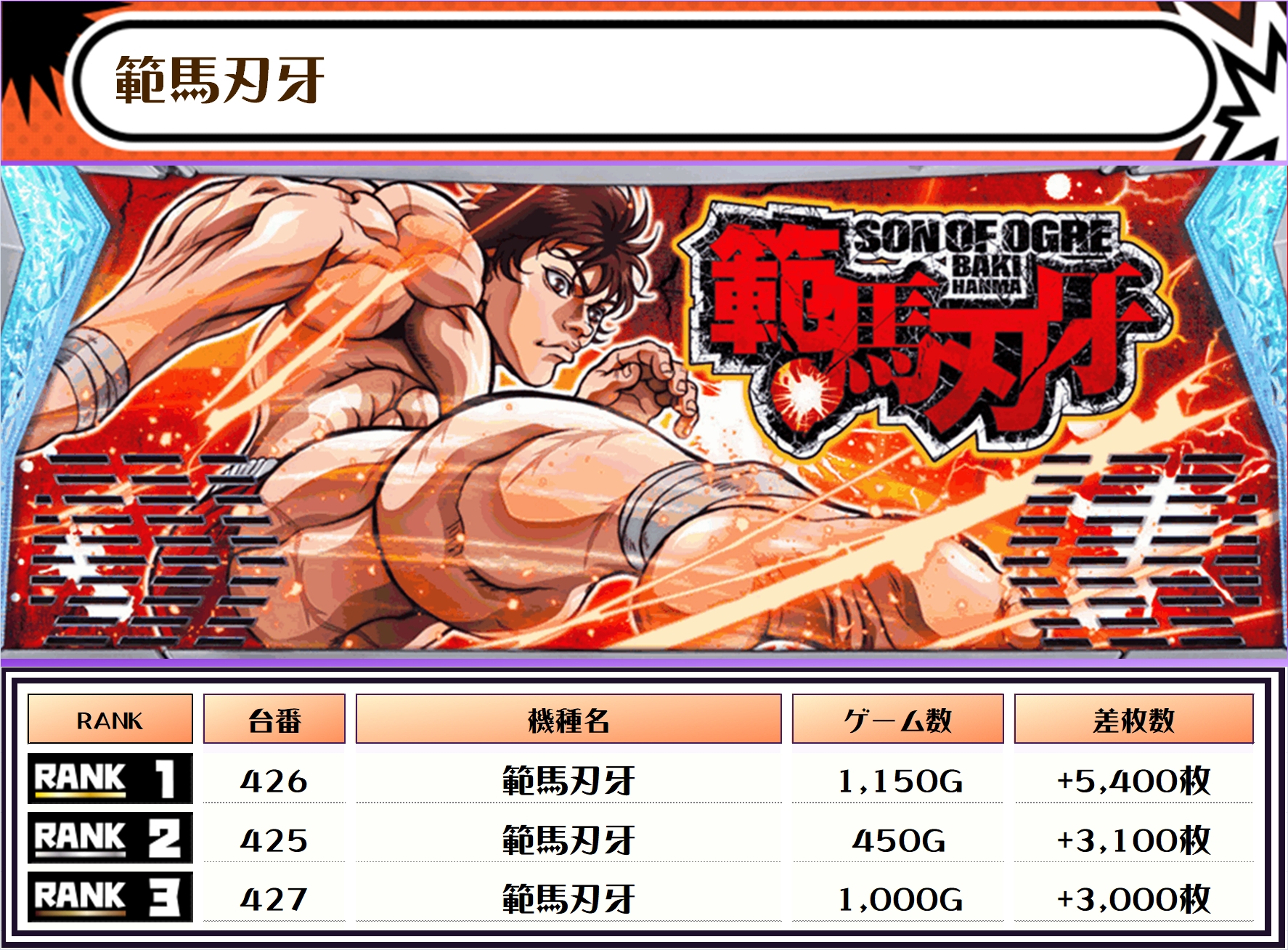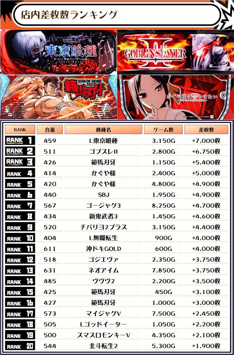 2位には【ゴブスレⅡ・511番台】の+6,750枚、3位は【範馬刃牙・426番台】の+5,400枚がランクインっ🏆🏆🏆