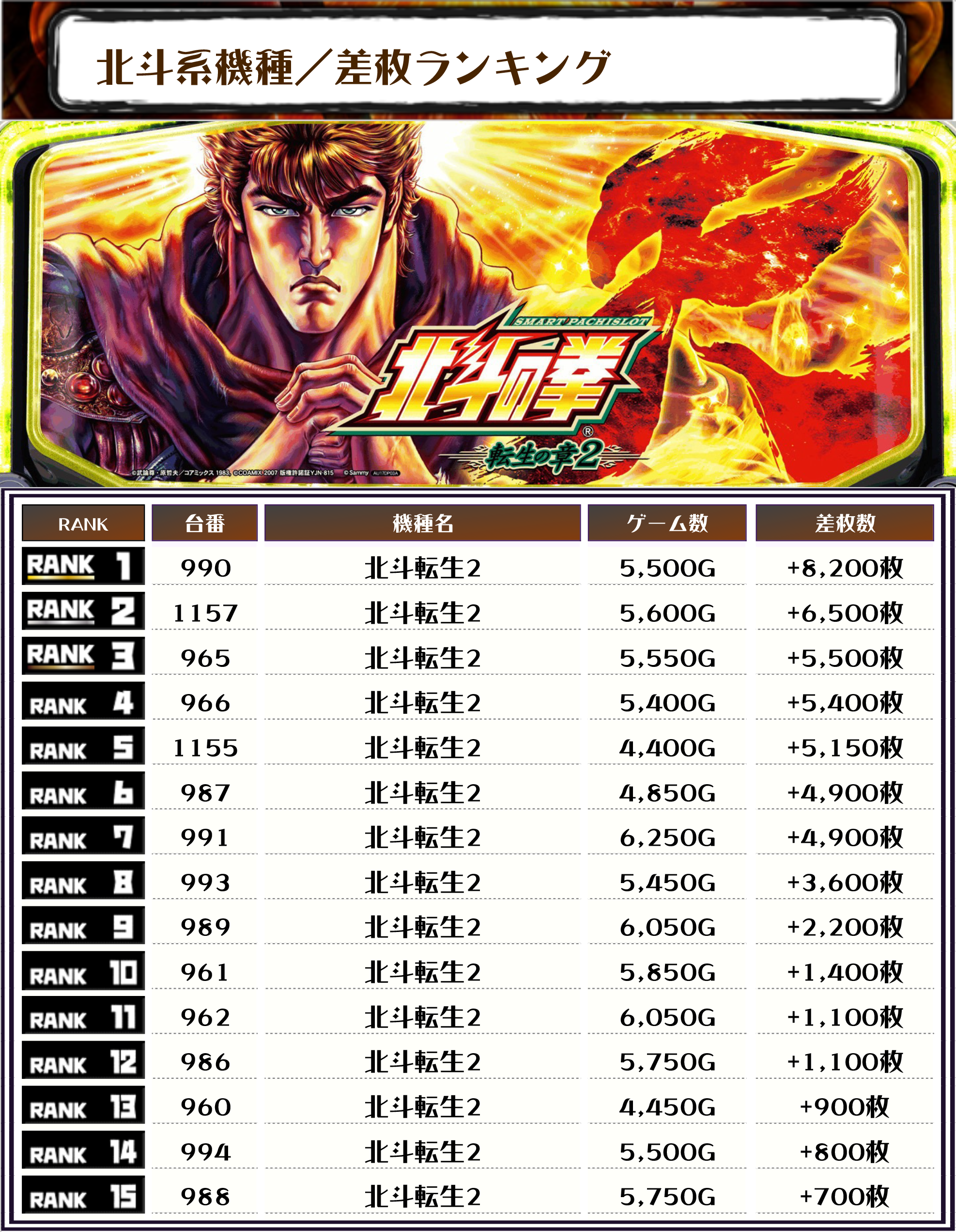 また、2位にも【北斗転生2・1157番台】の+6,500枚、そして3位にも【北斗転生2・965番台】の+5,500枚がランクインしました🏆
