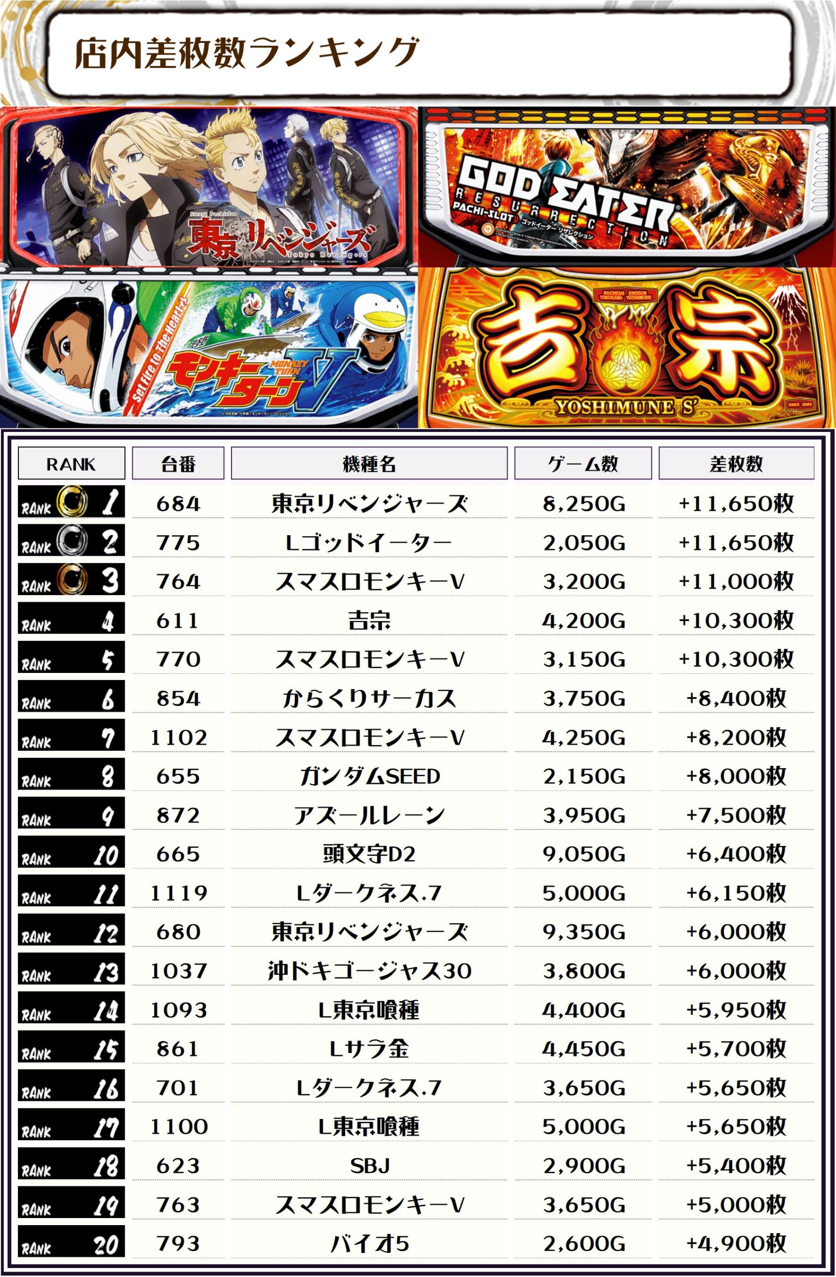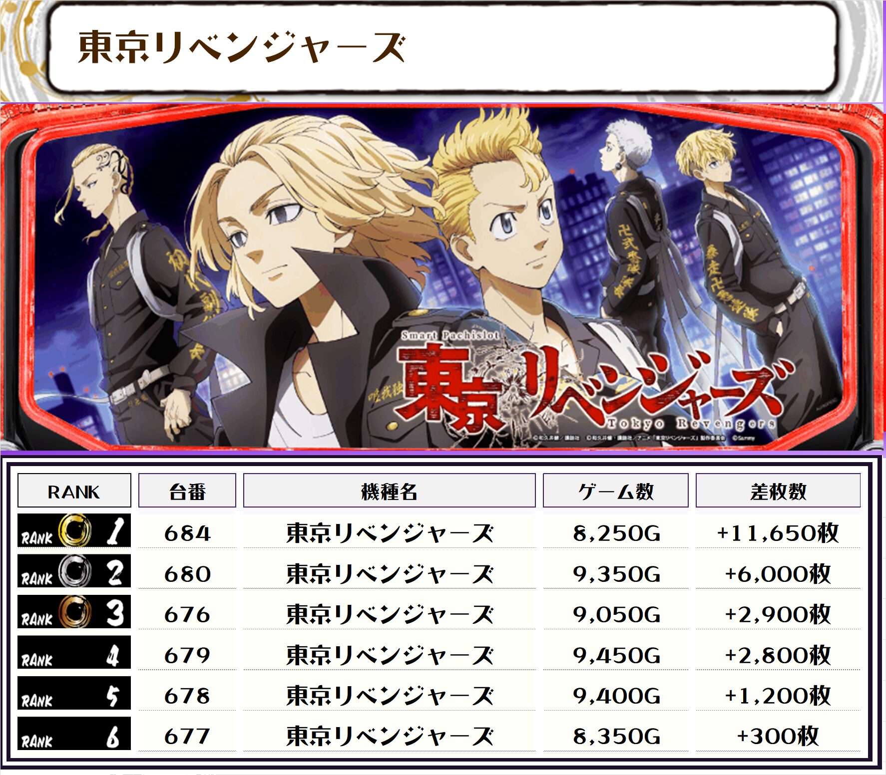 この日、全体の差枚トップに輝いたのは【東京リベンジャーズ・684番台】で+11,650枚‼️