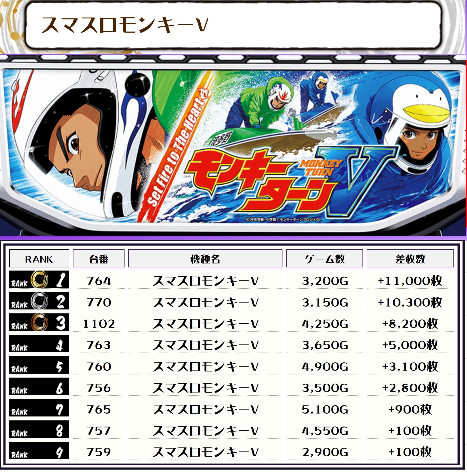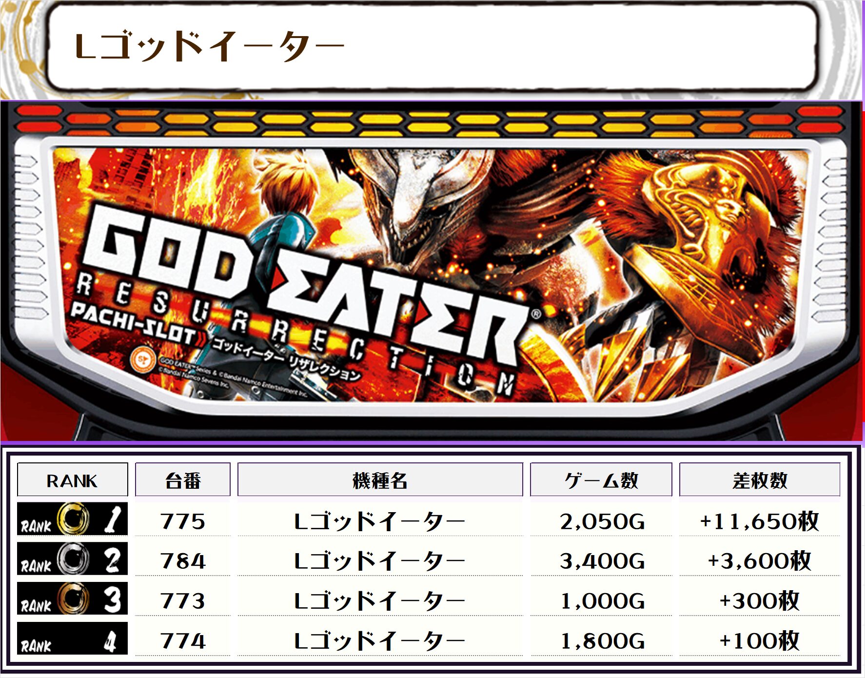 2位には【Lゴッドイーター・775番台】の+11,650枚、そして3位には【スマスロモンキーV・764番台】の+11,000枚がランクインっ🏆🏆🏆