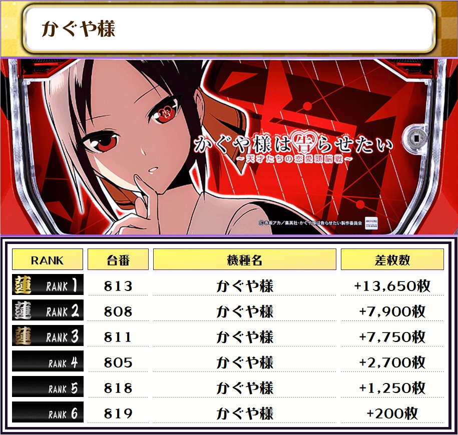 この日の全体差枚TOPは【かぐや様・813番台】の+13,650枚❗️
