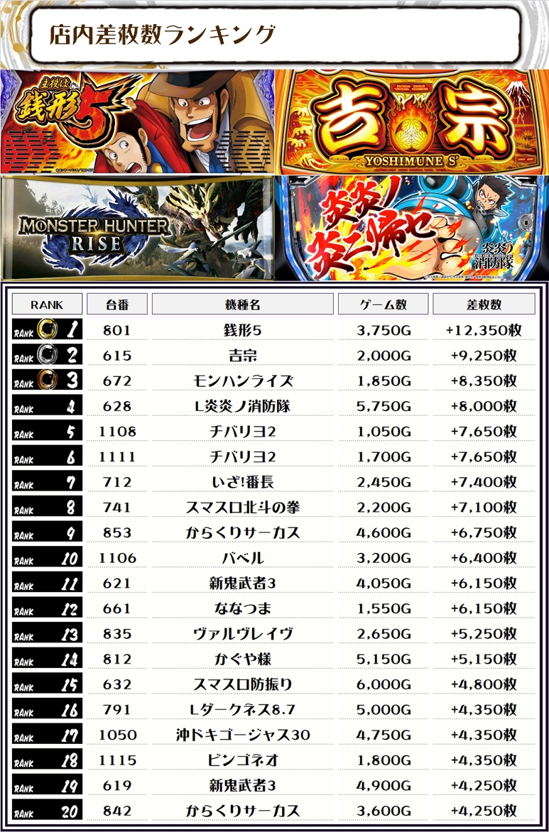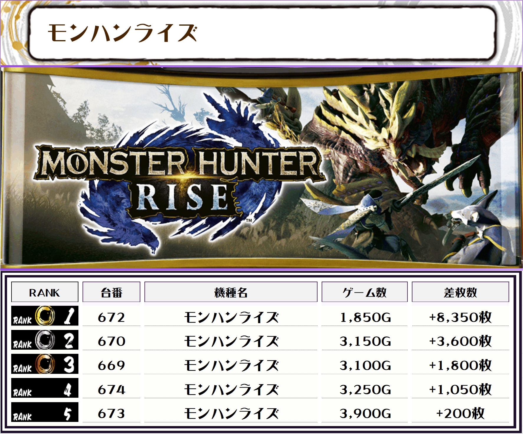 2位には【吉宗・615番台】の+9,250枚、そして3位には【モンハンライズ・672番台】の+8,350枚がランクインっ🏆🏆🏆