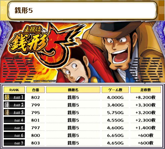 続く2位には【銭形5・802番台】の+8,200枚、そして3位には同率で【Lゴッドイーター・773番台】の+7,950枚がランクインしていますっ👍