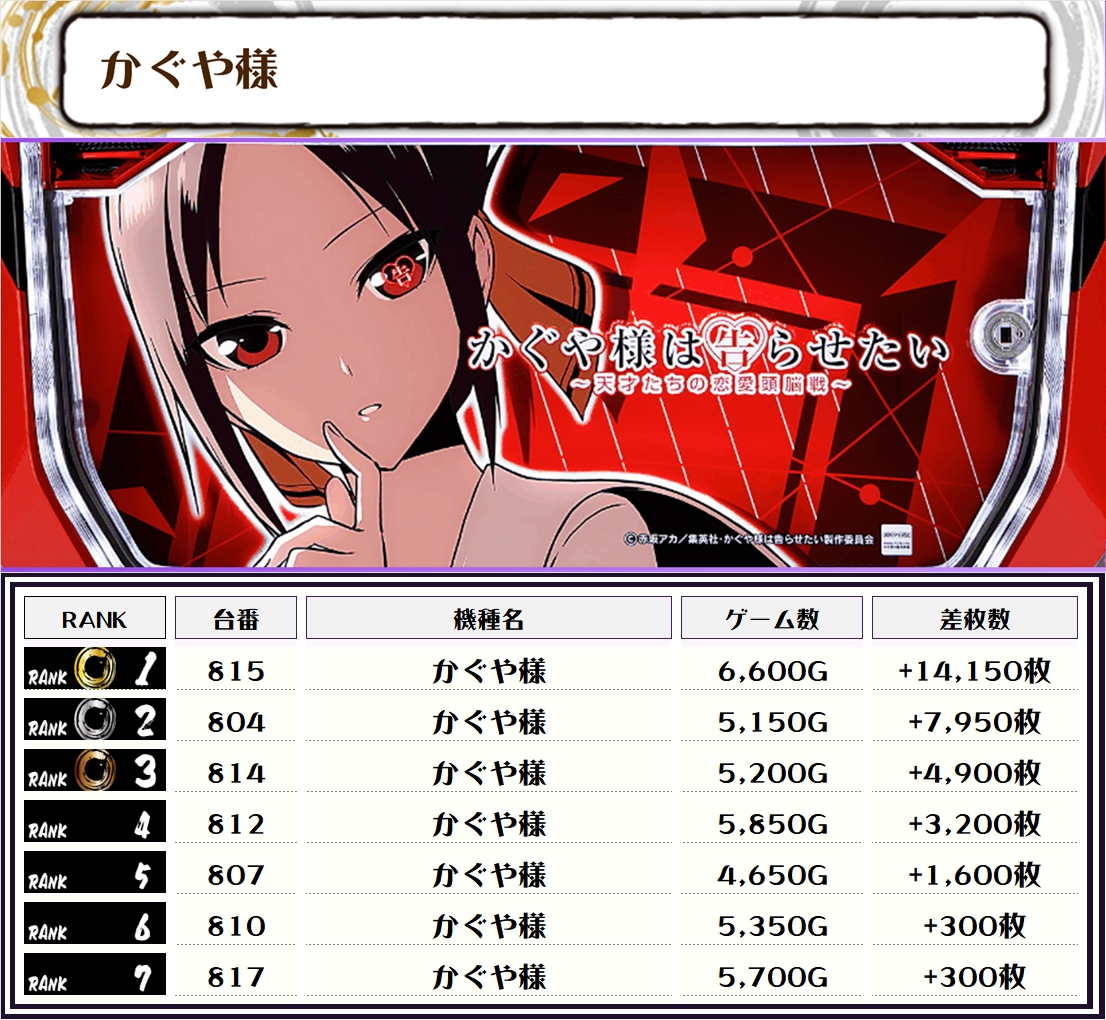この日、全体の差枚トップに輝いたのは【かぐや様・815番台】で+14,150枚‼️