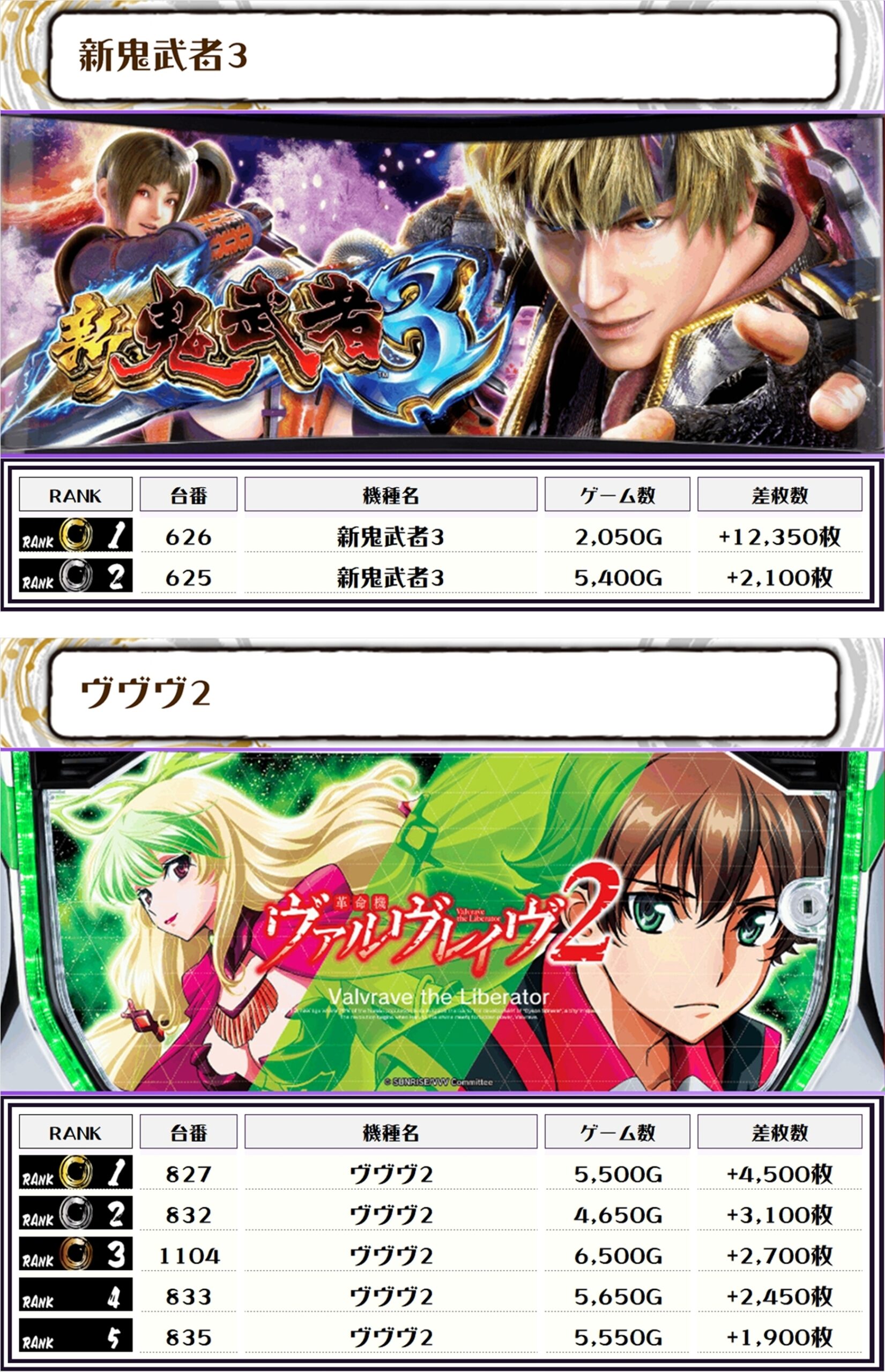 2位には【新鬼武者3・626番台】の+12,350枚、そして3位には【スマスロ北斗の拳・726番台】の+12,150枚がランクインっ🏆🏆🏆