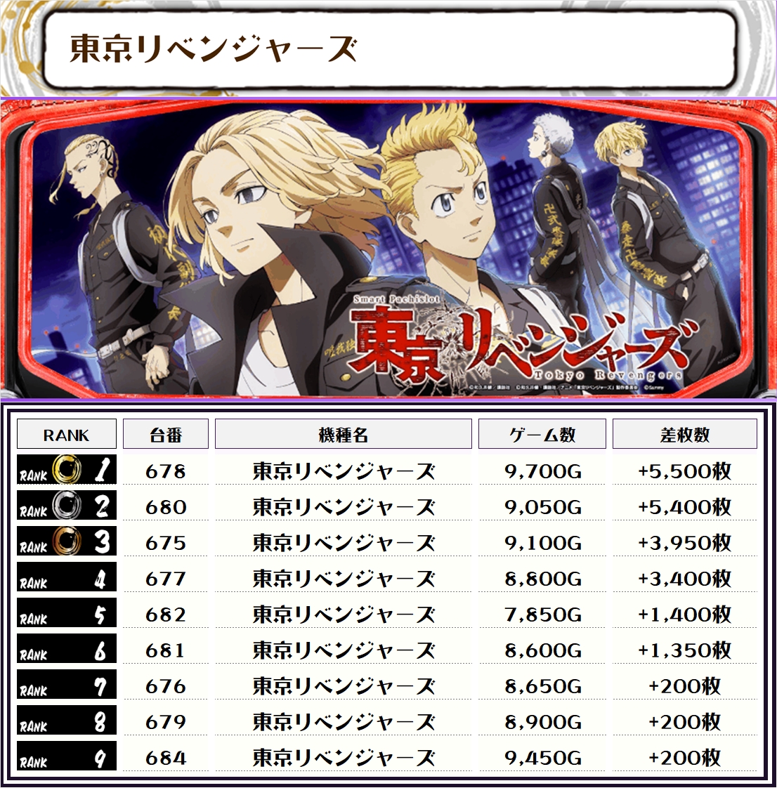 東京リベンジャーズカバネリはほとんどの台が差枚でプラス、どれもフル稼働という素晴らしい挙動で圧巻の結果を見せてくれました🔎