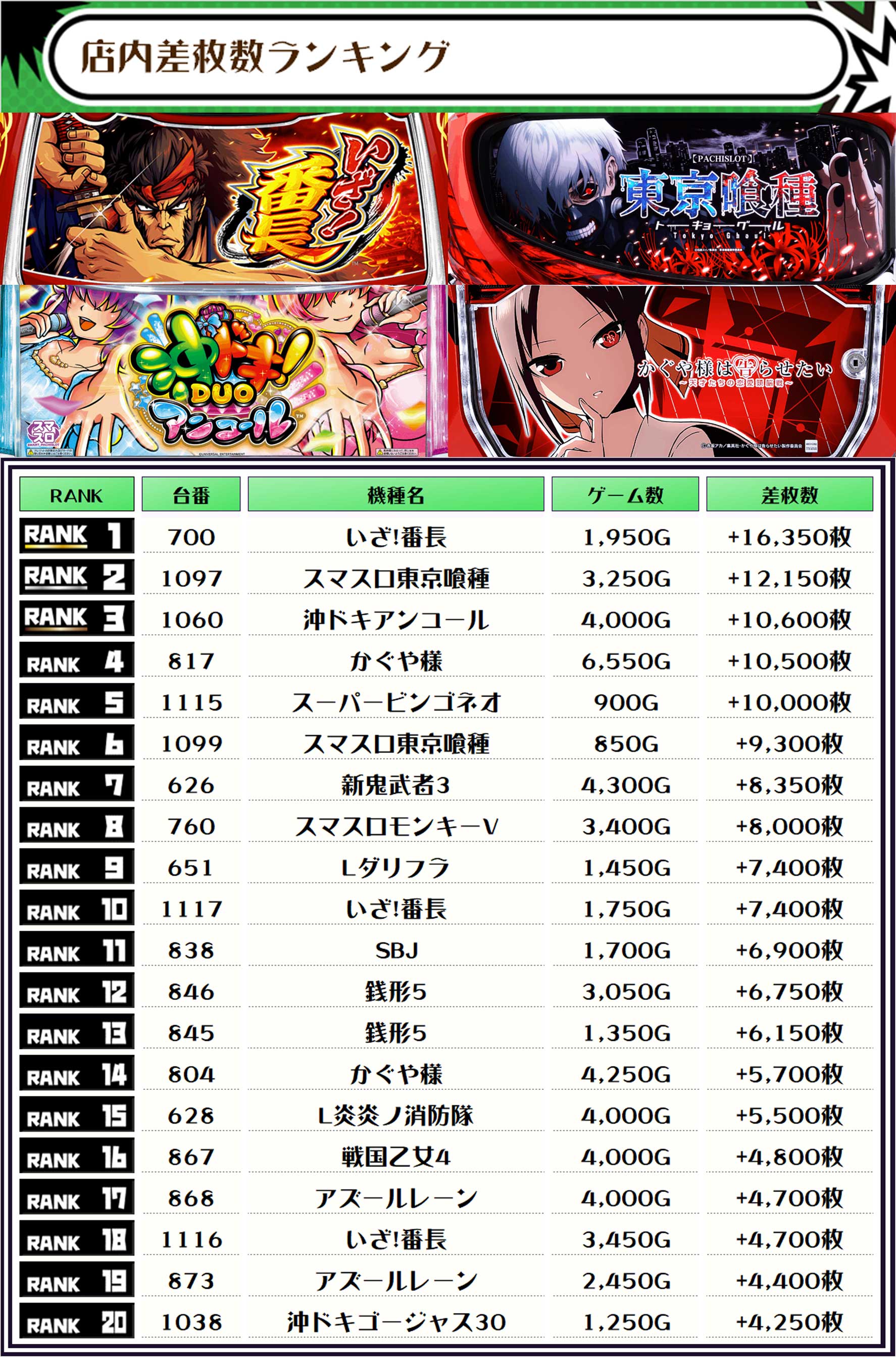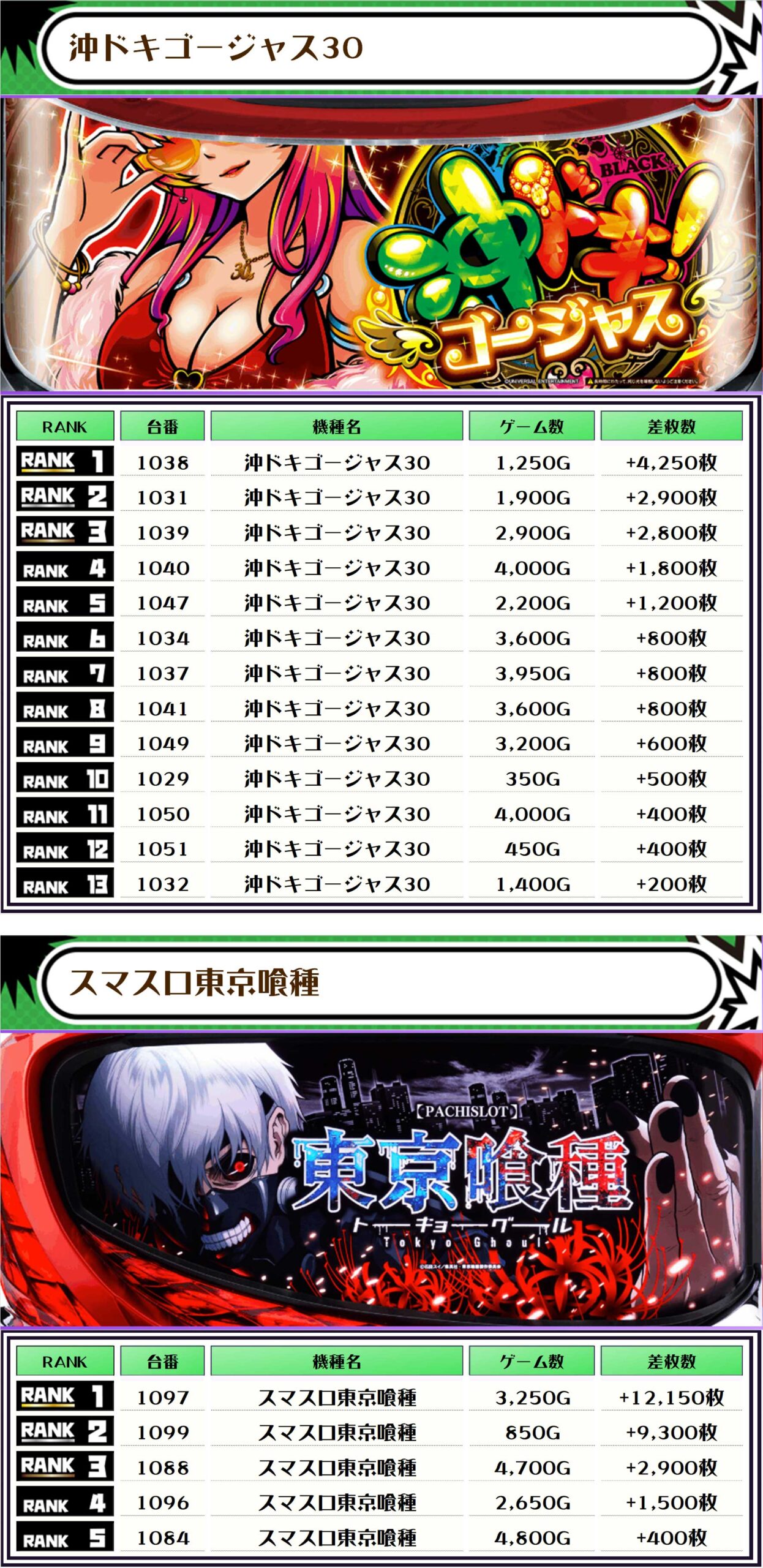 2位には【スマスロ東京喰種・1097番台】の+12,150枚、そして3位には【沖ドキアンコール・1060番台】の+10,600枚がランクインっ🏆🏆🏆
