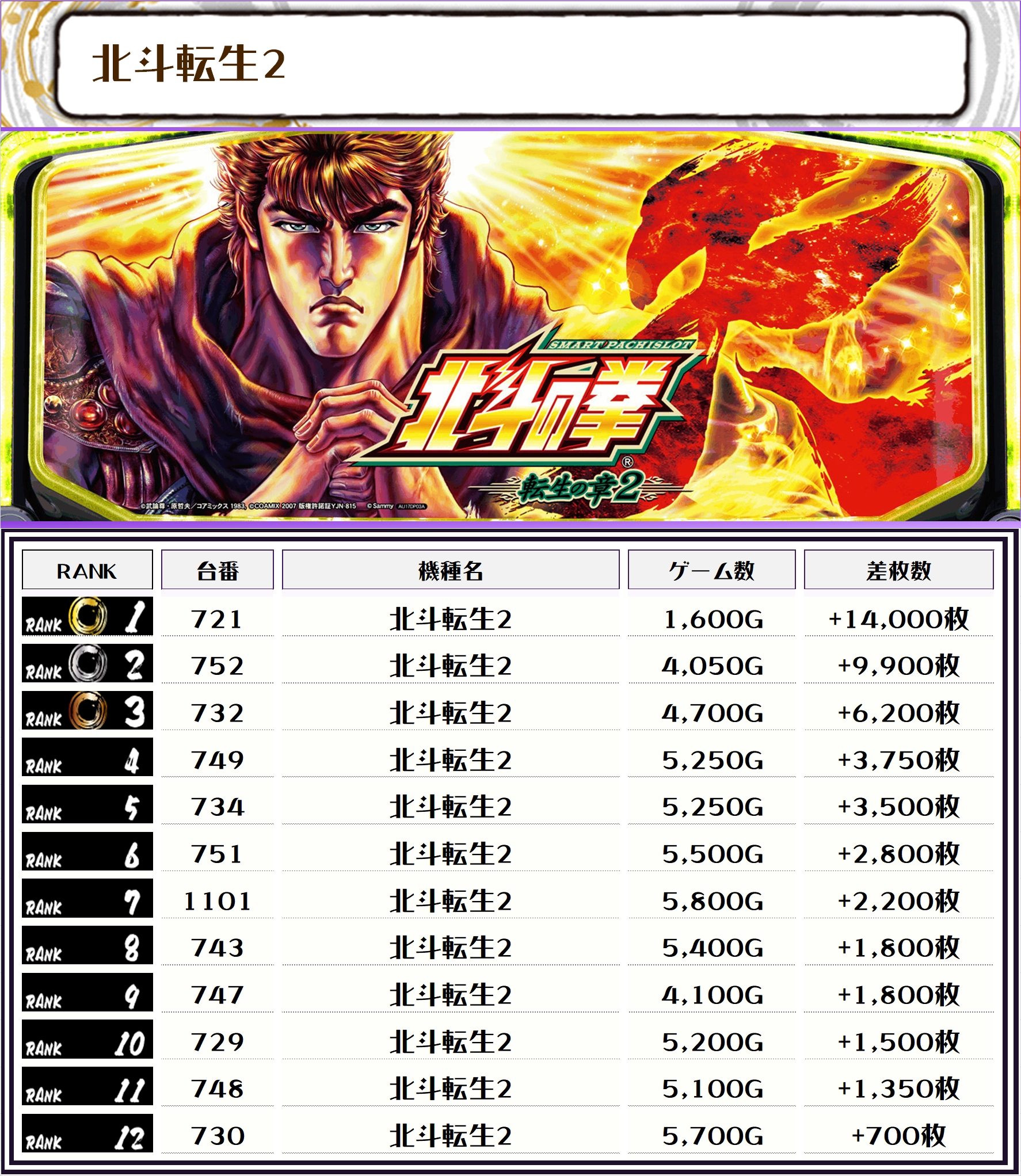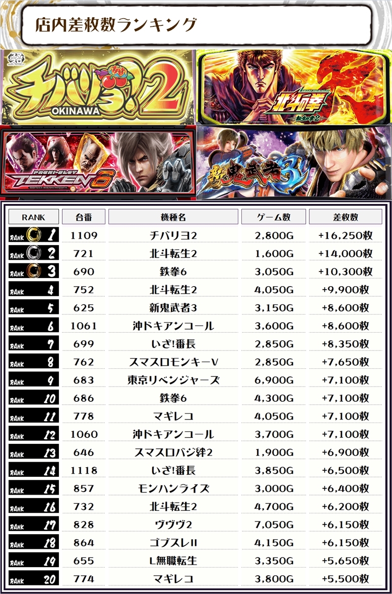 2位には【北斗転生2・721番台】の+14,000枚、そして3位には【鉄拳6・690番台】の+10,300枚がランクインっ🏆🏆🏆