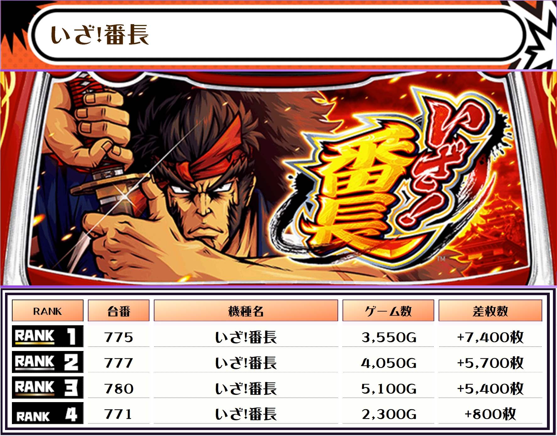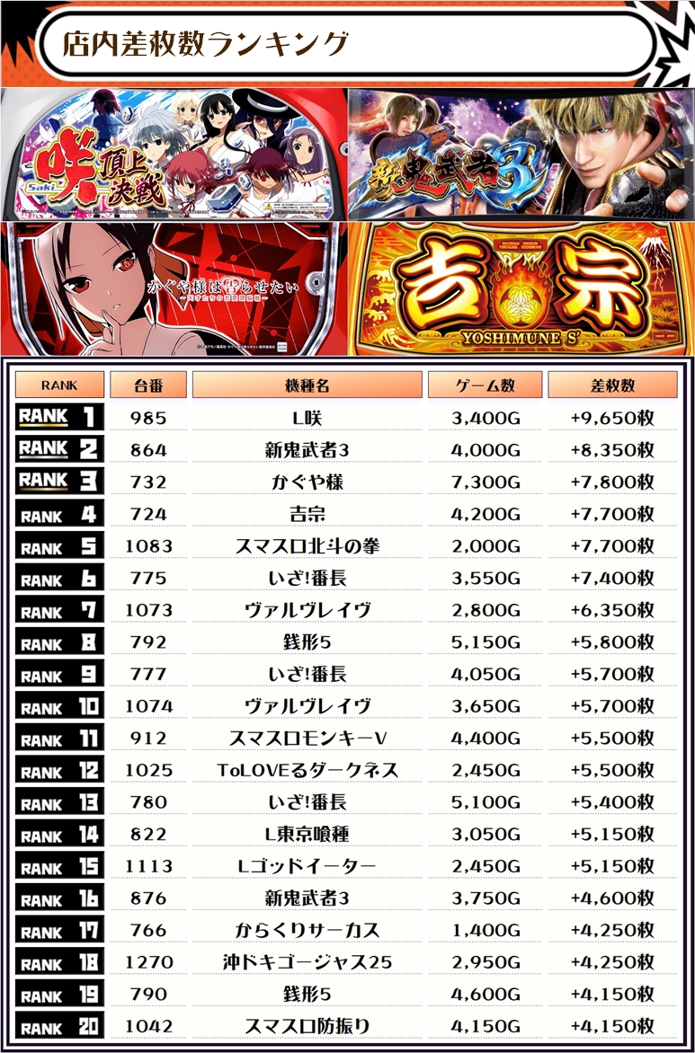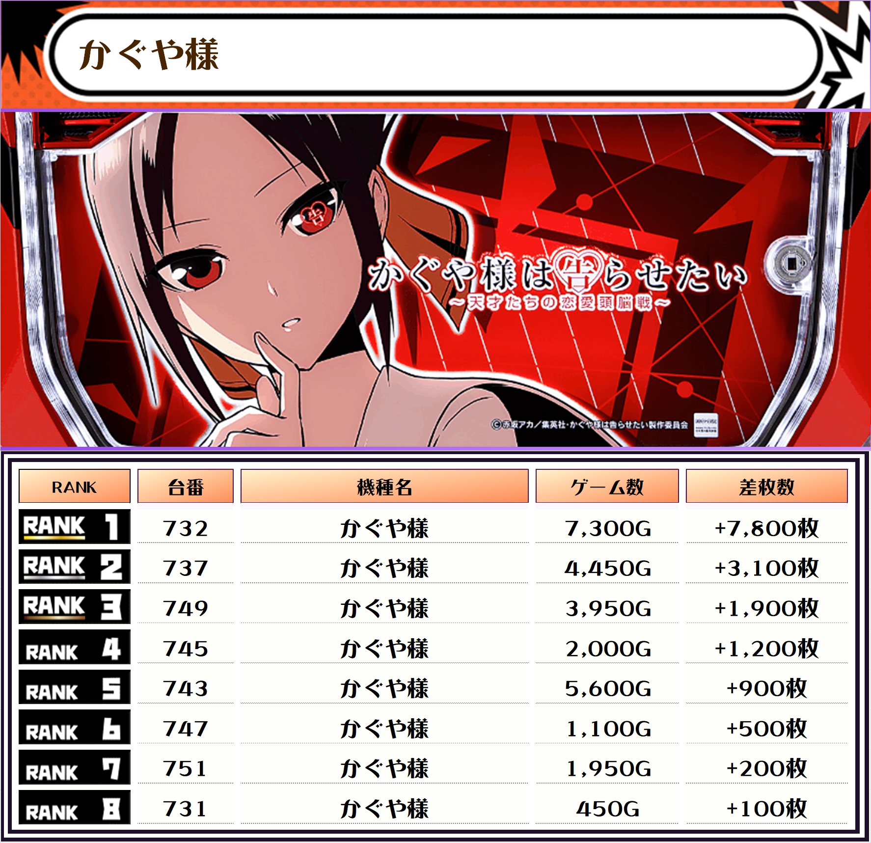 2位には【新鬼武者3・864番台】の+8,350枚、そして3位には【かぐや様・732番台】の+7,800枚がランクインっ🏆🏆🏆🏆
