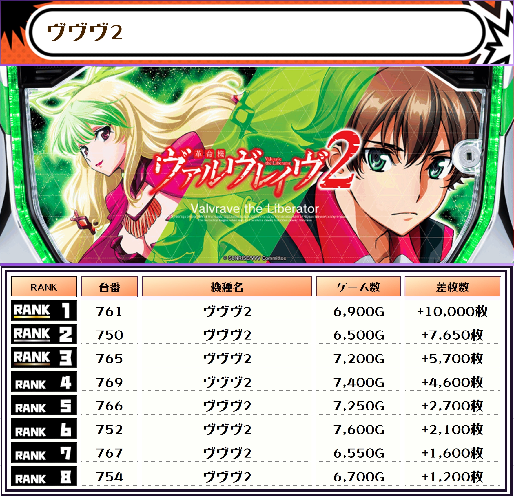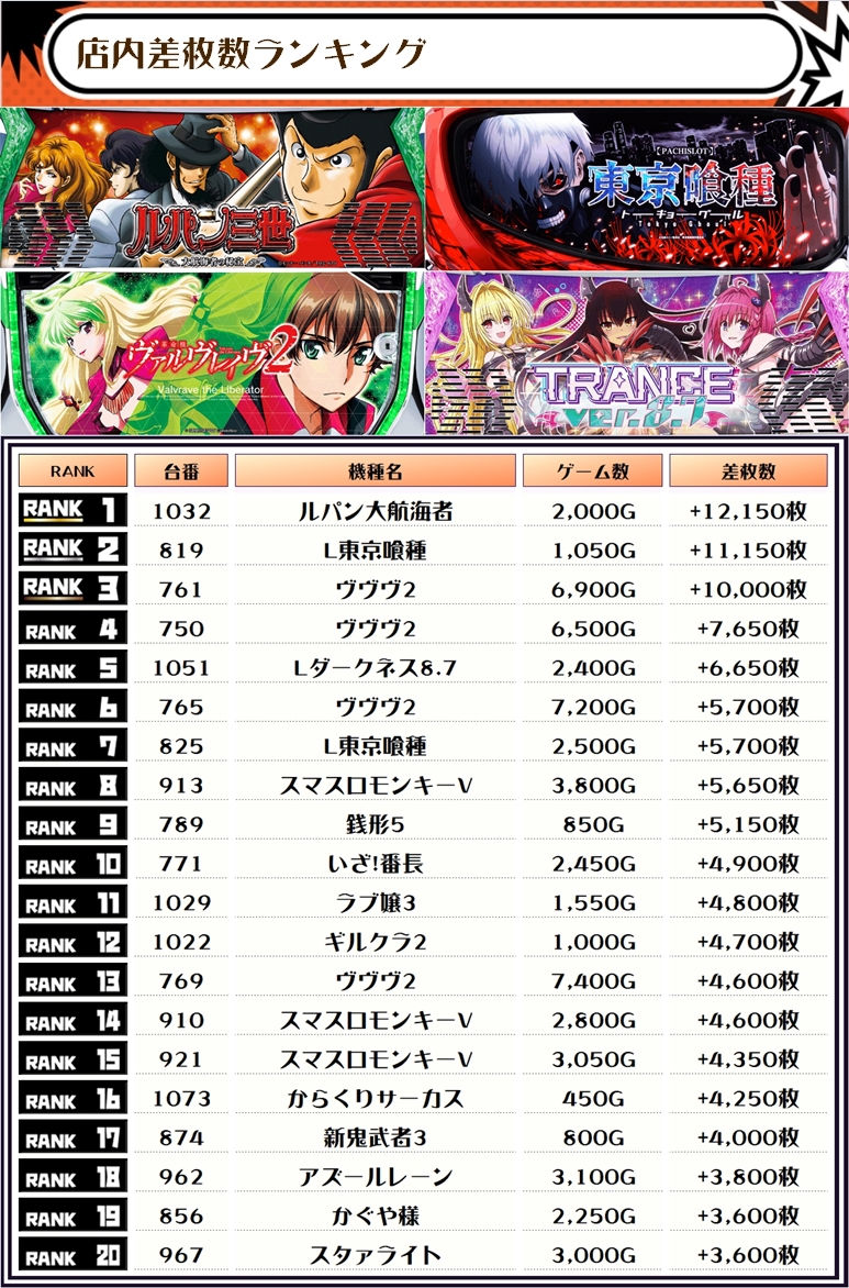 2位には【L東京喰種・819番台】の+11,150枚、そして3位には【ヴヴヴ2・761番台】の+10,000枚がランクインっ🏆🏆🏆🏆