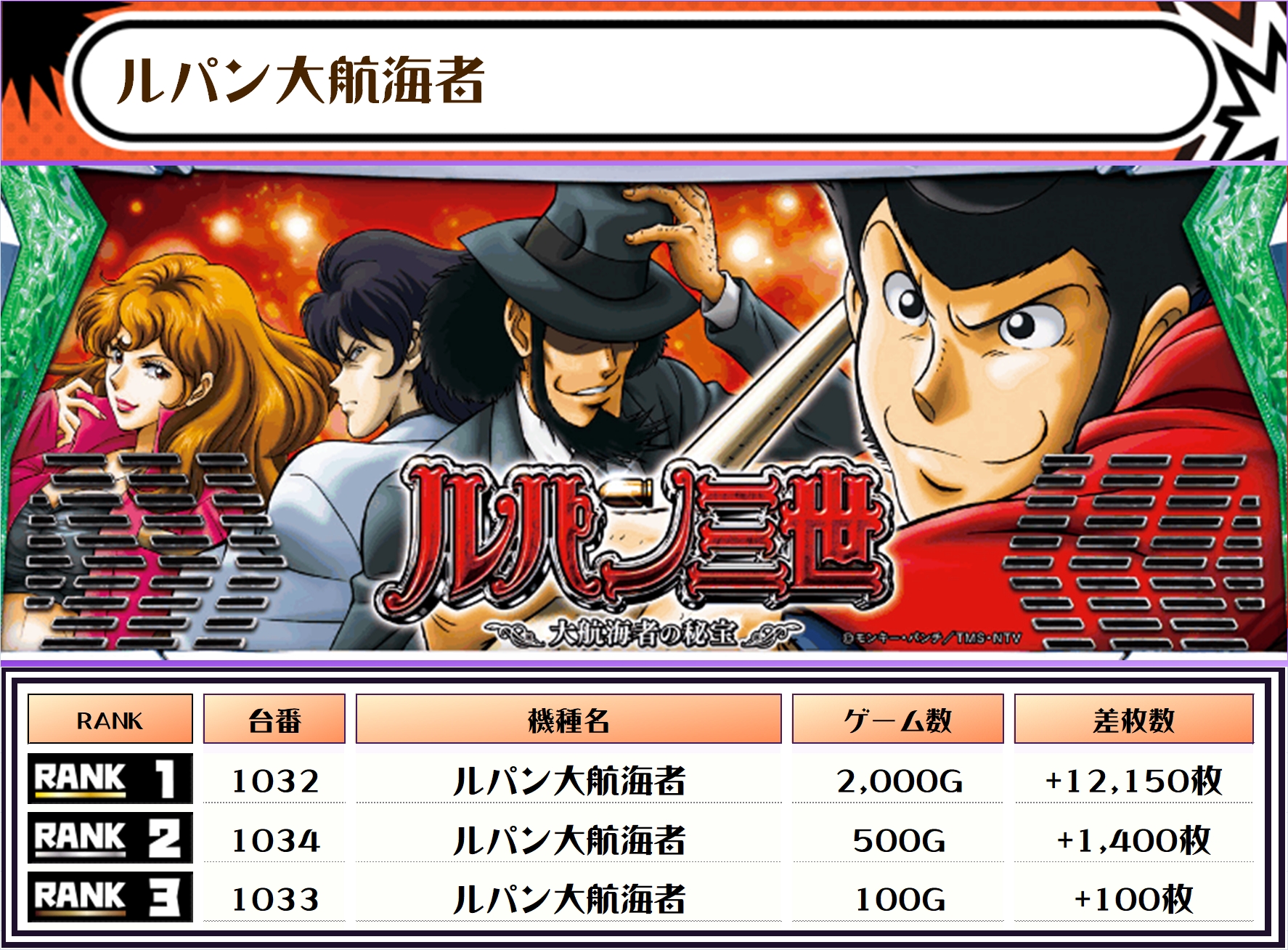 この日、全体の差枚トップに輝いたのは【ルパン大航海者・1032番台】で+12,150枚🔥