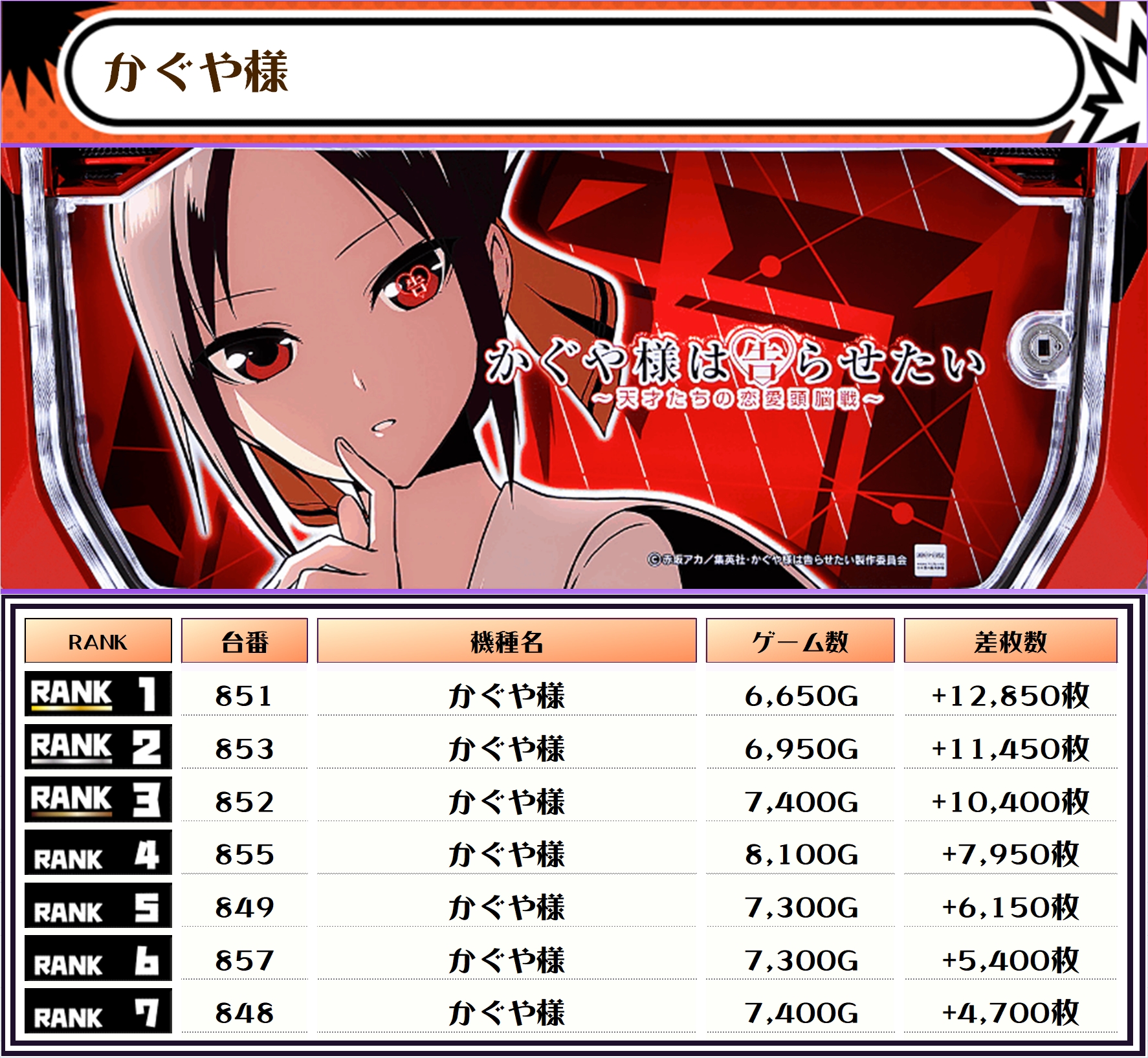 この日、全体の差枚トップに輝いたのは【かぐや様・851番台】で+12,850枚🏆🏆🏆