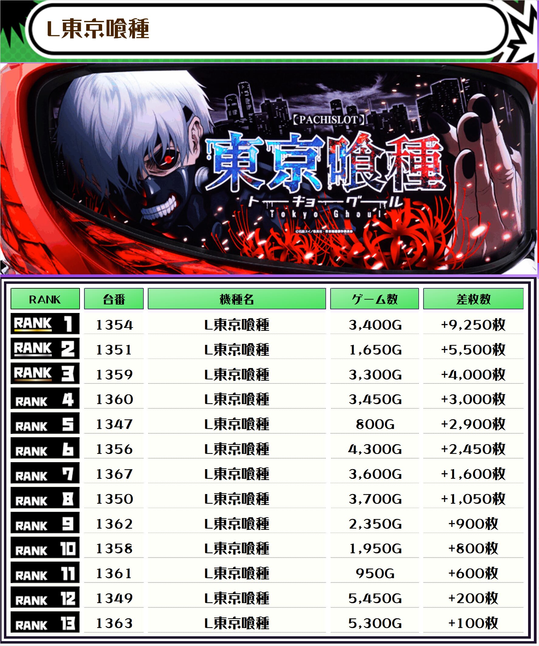 この日、全体の差枚トップに輝いたのは【L東京喰種・1354番台】の+9,250枚‼️