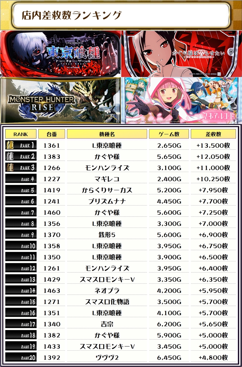 2位には【かぐや様・1383番台】の+12,050枚、そして3位には【モンハンライズ・1266番台】の+11,000枚がランクインですっ🏆🏆🏆🏆