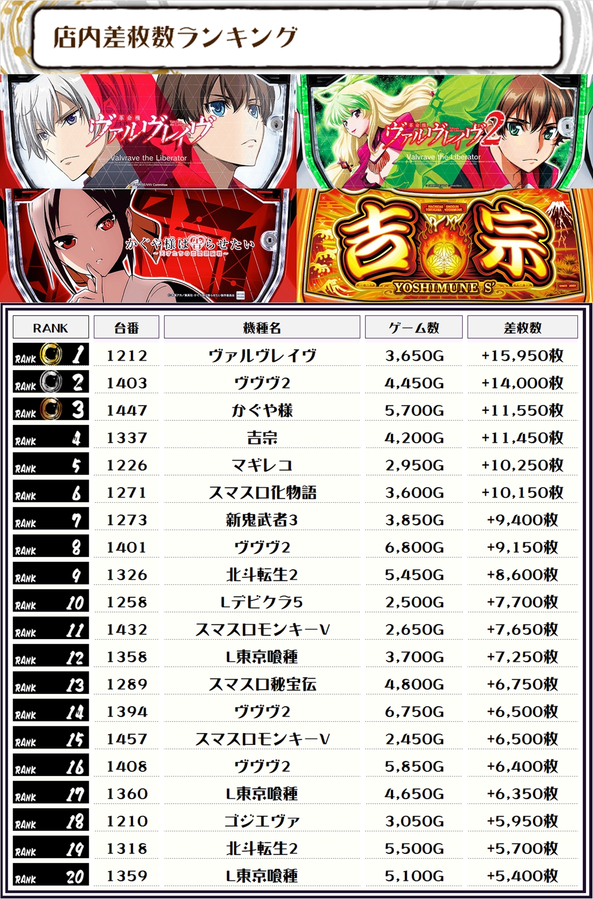 2位には【ヴヴヴ2・1403番台】の+14,000枚、そして3位には【かぐや様・1447番台】の+11,550枚がランクインっ🏆🏆🏆