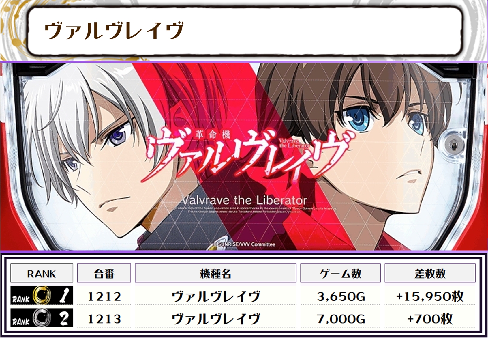 この日、全体の差枚トップに輝いたのは【ヴァルヴレイヴ・1212番台】で+15,950枚‼️