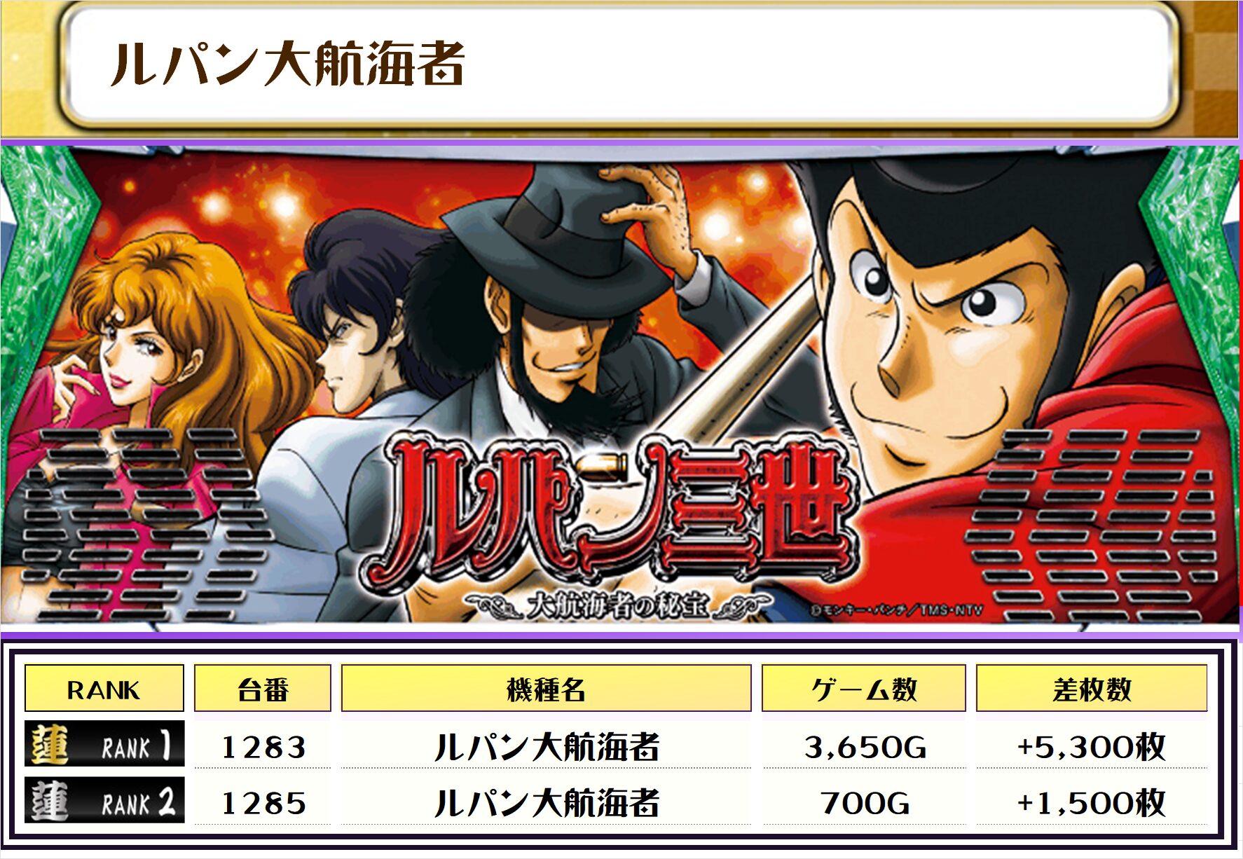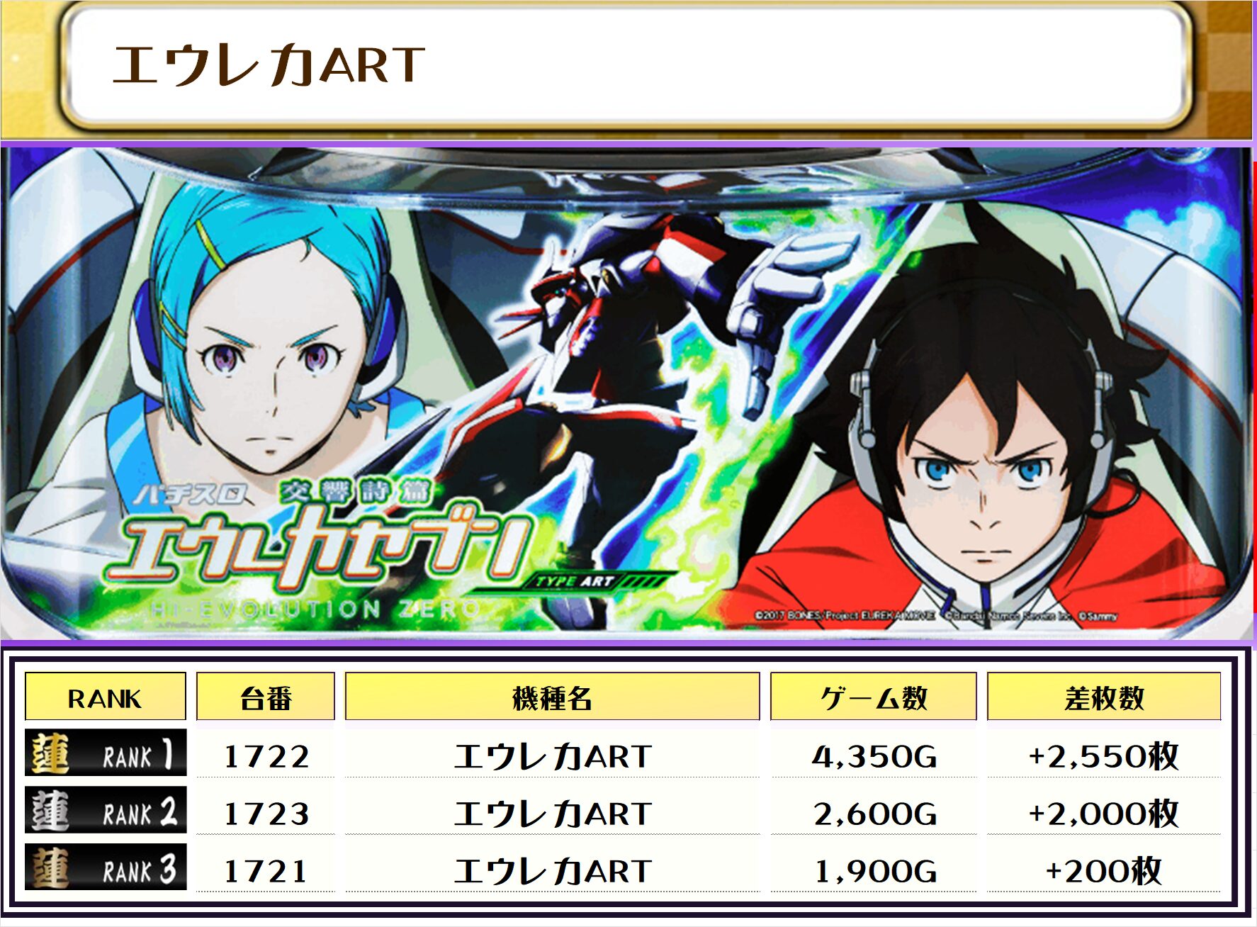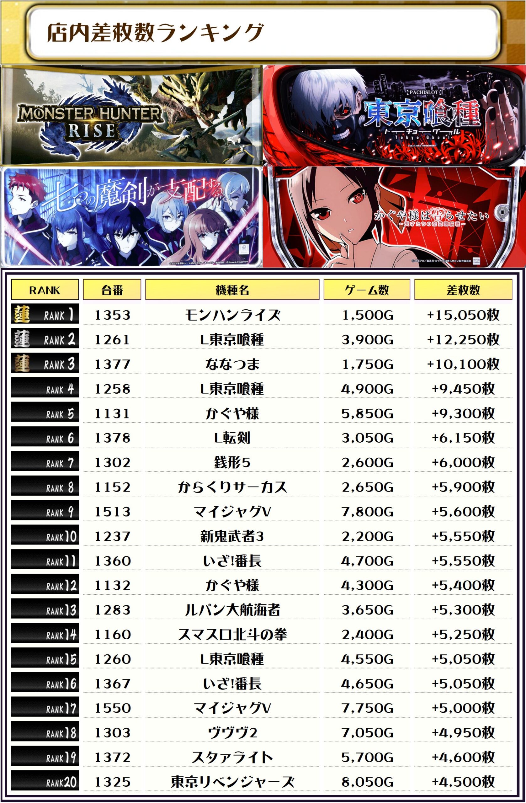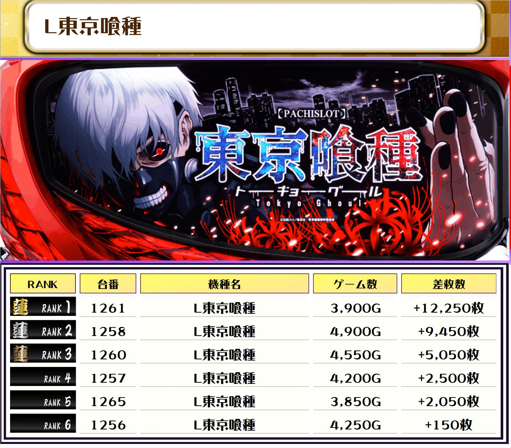 続く2位には【L東京喰種・1261番台】の+12,250枚、そして3位には【ななつま・1377番台】の+10,100枚がランクイン❗️