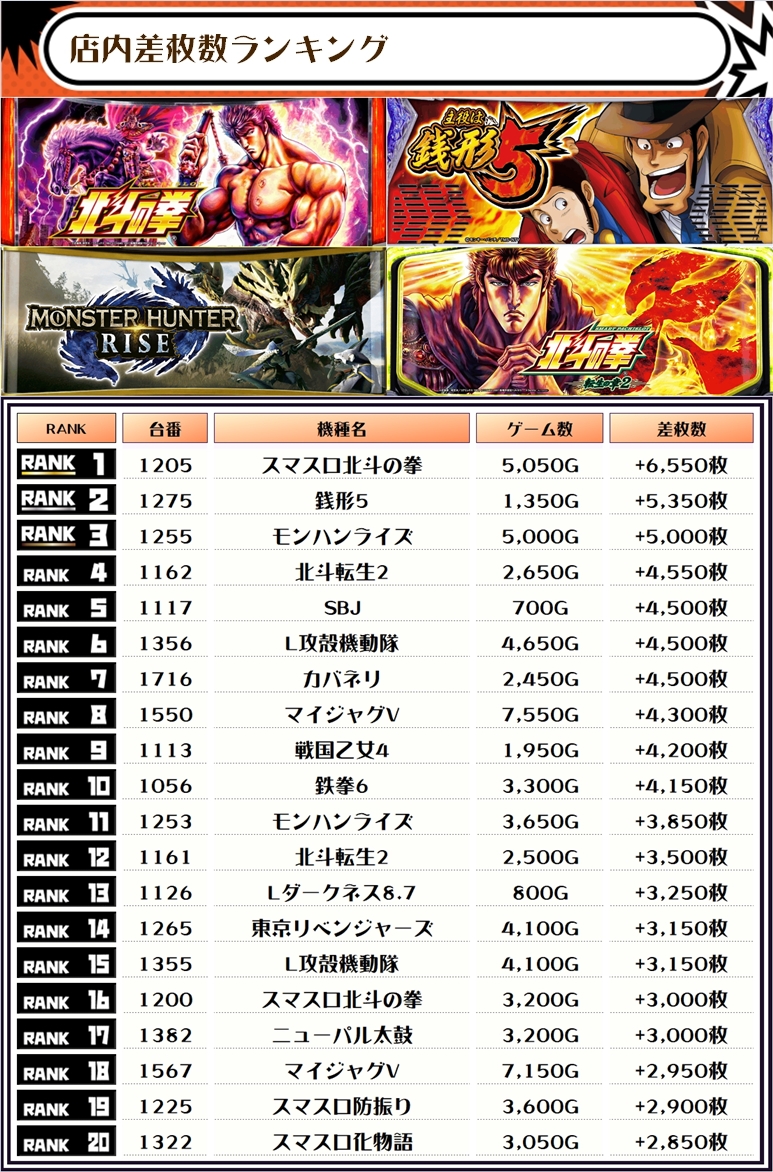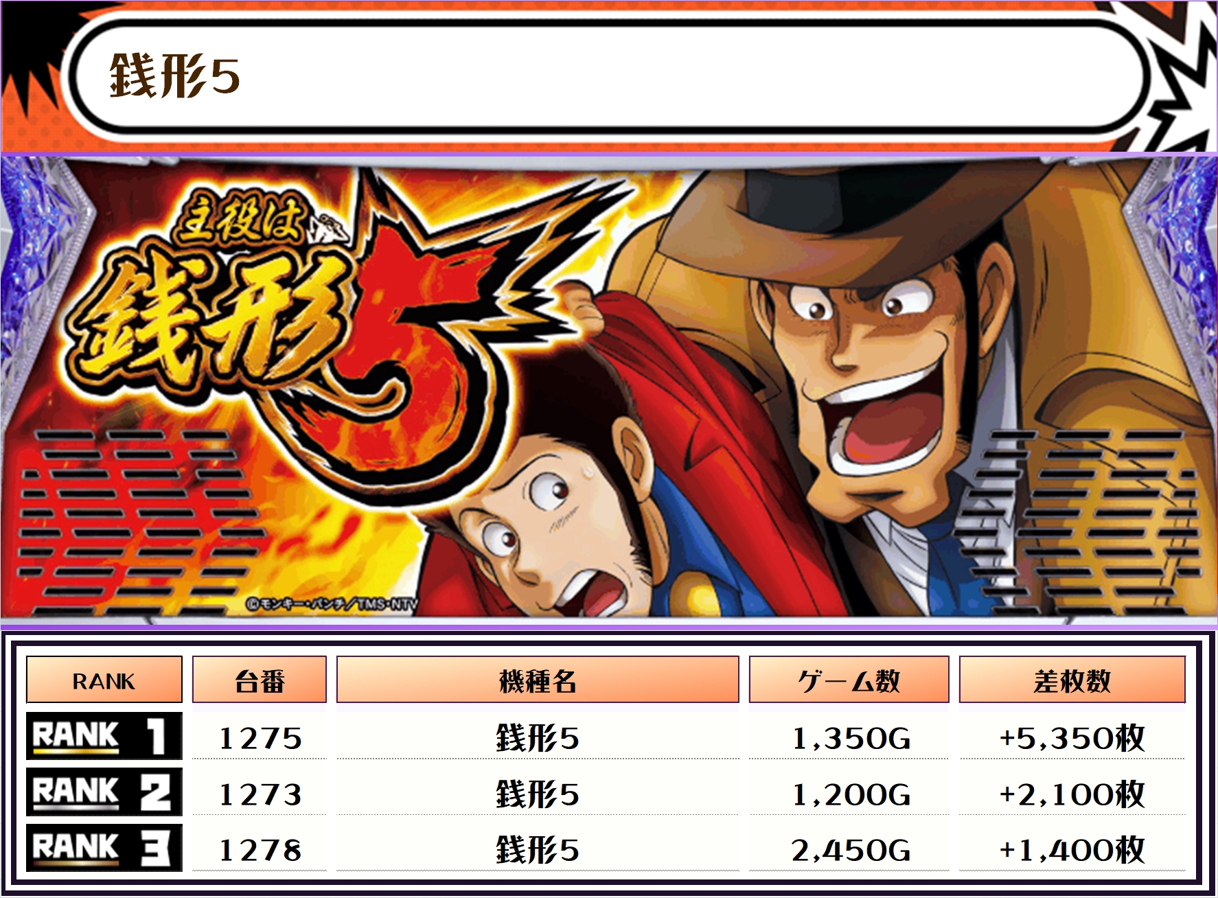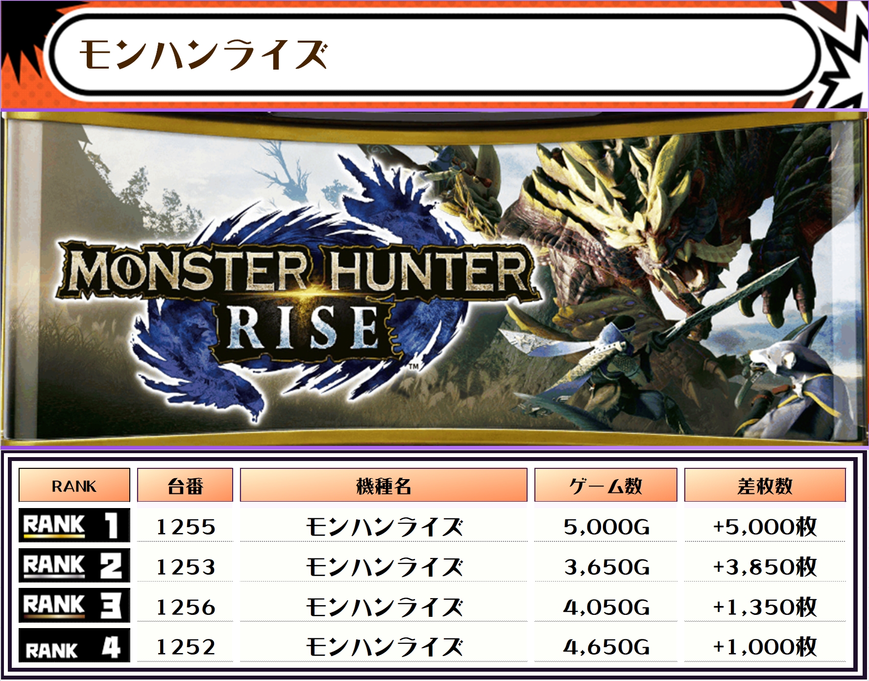 続く2位には【銭形5・1275番台】の+5,350枚、3位には【モンハンライズ・1255番台】の+5,000枚がランクインっ🏆🏆🏆🏆