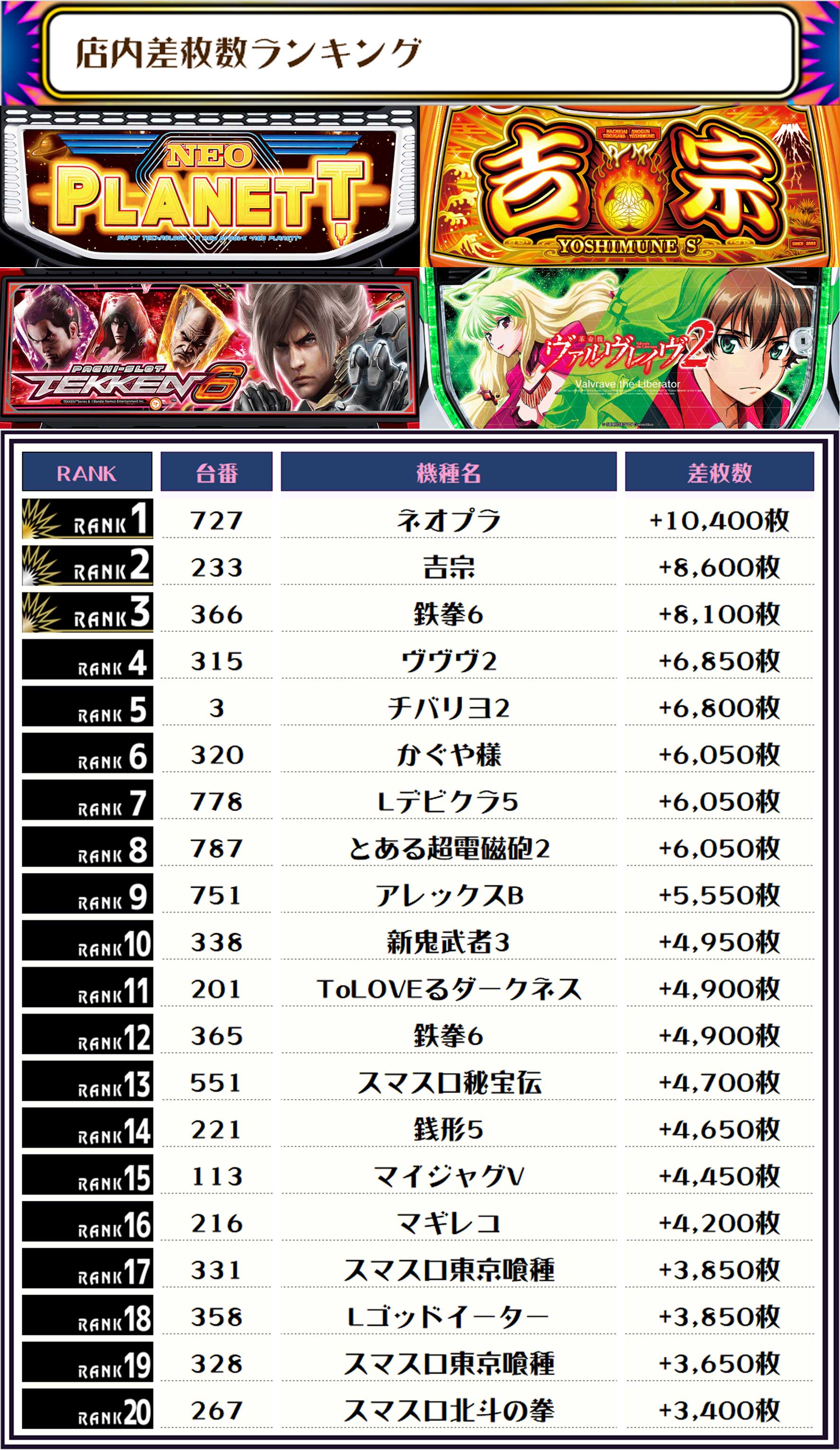 全体のTOP差枚は【ネオプラ・727番台】で+10,400枚を獲得っ❗️