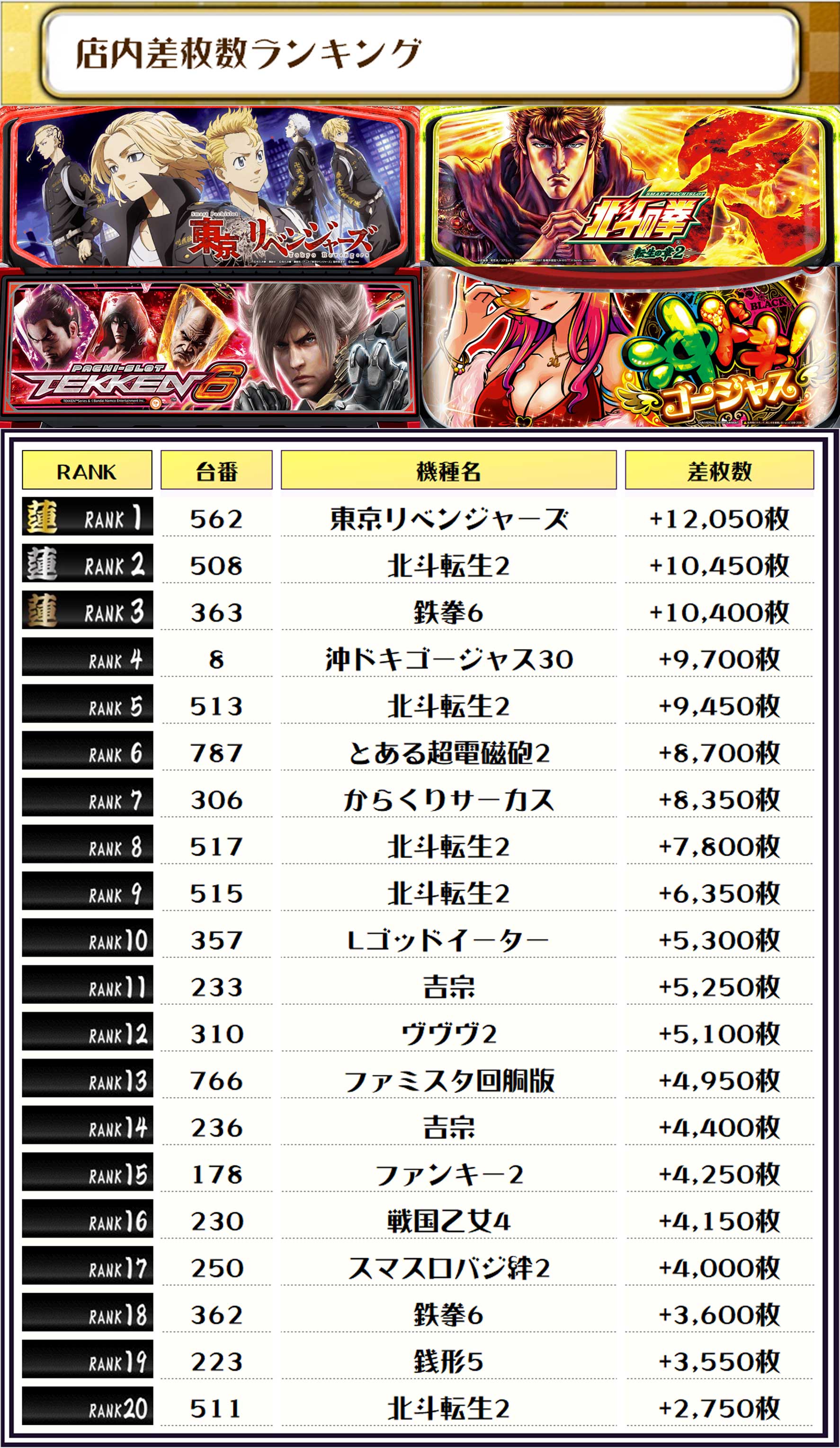 全体のTOP差枚は【東京リベンジャーズ・562番台】で+12,050枚っ❗️