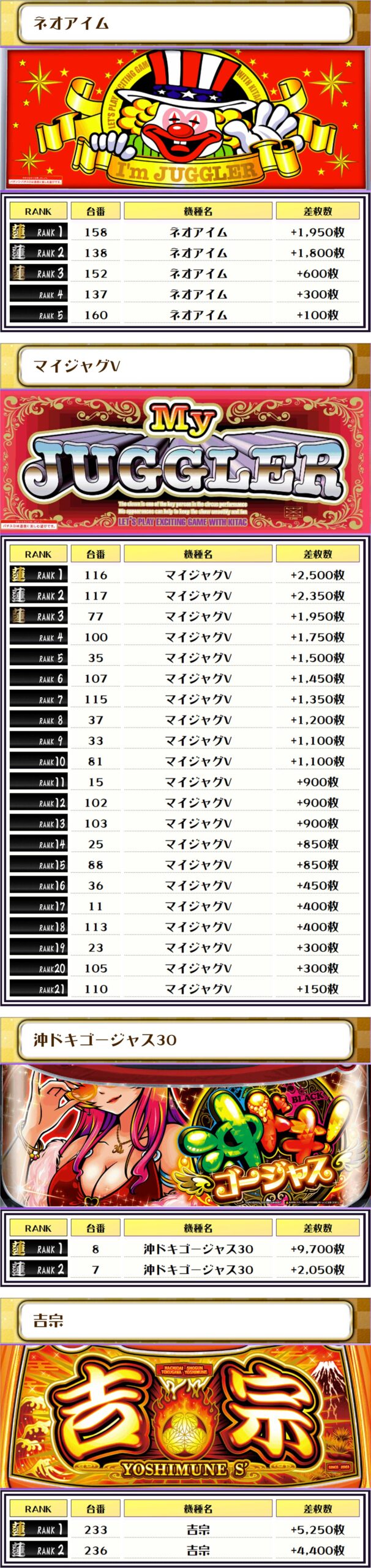 それでは、この日の【機種別差枚ランキング】を見ていきましょう❗️