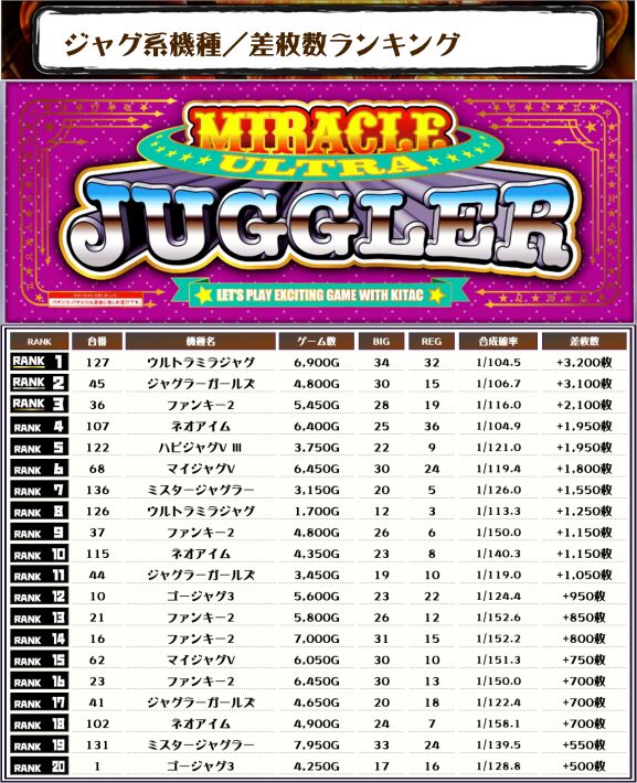 ということで、この日のトップ差枚は【ウルトラミラジャグ・127番台】で+3,200枚でした👑