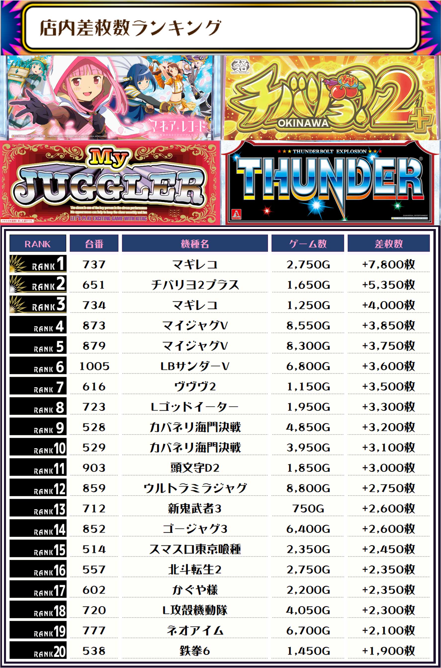2位には【チバリヨ2プラス・651番台】の+5,350枚、そして3位には【マギレコ・734番台】の+4,000枚がランクインでっ🏆🏆🏆🏆