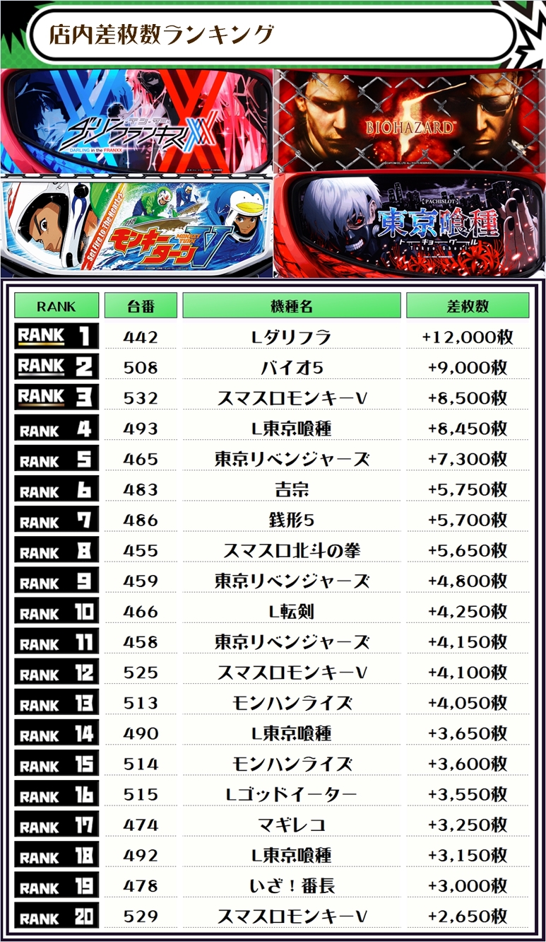2位には【バイオ5・508番台】の+9,000枚、そして3位には【スマスロモンキーV・532番台】の+8,500枚がランクインっ🏆🏆🏆